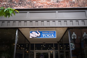 The photograph captures the inviting entrance of a yoga studio, featuring a prominent sign with an elephant illustration. Warm, ambient lighting from within creates a soothing atmosphere, while the rustic brick wall adds texture and charm, enhancing the peaceful vibe of the space. Lush greenery at the edges introduces a natural element, further emphasizing tranquility and mindfulness.