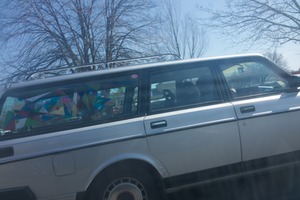 A silver station wagon is captured in motion, with the window displaying a vibrant collage of colored geometric shapes that contrast against the muted exterior. Sunlight filters through the glass, illuminating the colors while casting soft reflections on the car's surface. The surrounding bare trees suggest a transition to spring, enhancing the nostalgic and playful vibe of the scene.