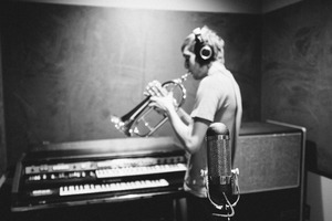 In a dimly lit studio, a musician is lost in the moment, playing a trumpet with intense focus. The composition frames the performer’s connection to their craft, with a vintage microphone foregrounded, drawing attention to the intimate atmosphere of sound creation. The black-and-white tones add a nostalgic feel, enhancing the emotional weight of the scene.