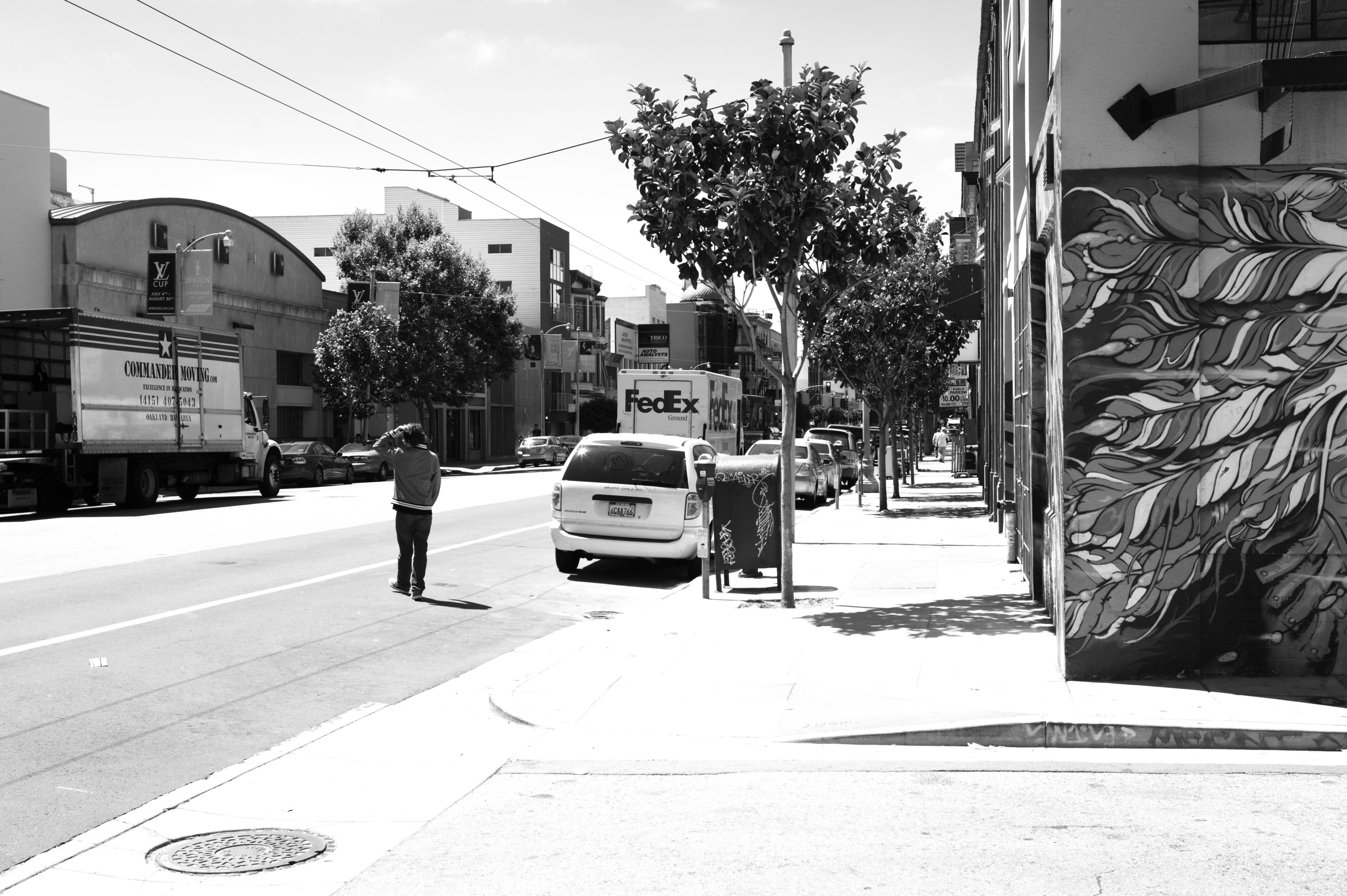 This black-and-white photograph captures a quiet urban street scene, where a solitary figure walks along the sidewalk, appearing contemplative against a backdrop of bustling city life. The composition juxtaposes the starkness of the asphalt and buildings with the soft forms of trees and a vibrant mural, creating a subtle tension. The monochromatic lighting adds a sense of nostalgia and calm, evoking a mood of silent introspection amidst the city's activity.