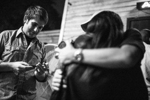 In a dimly lit setting, two individuals engage in a heartfelt embrace, conveying warmth and intimacy. A man in the foreground appears absorbed in his phone, adding a layer of contrast to the moment, while the soft, blurred background enhances the emotional focus of the scene. The monochromatic tones evoke a nostalgic atmosphere, highlighting the connections shared between friends in a fleeting moment.
