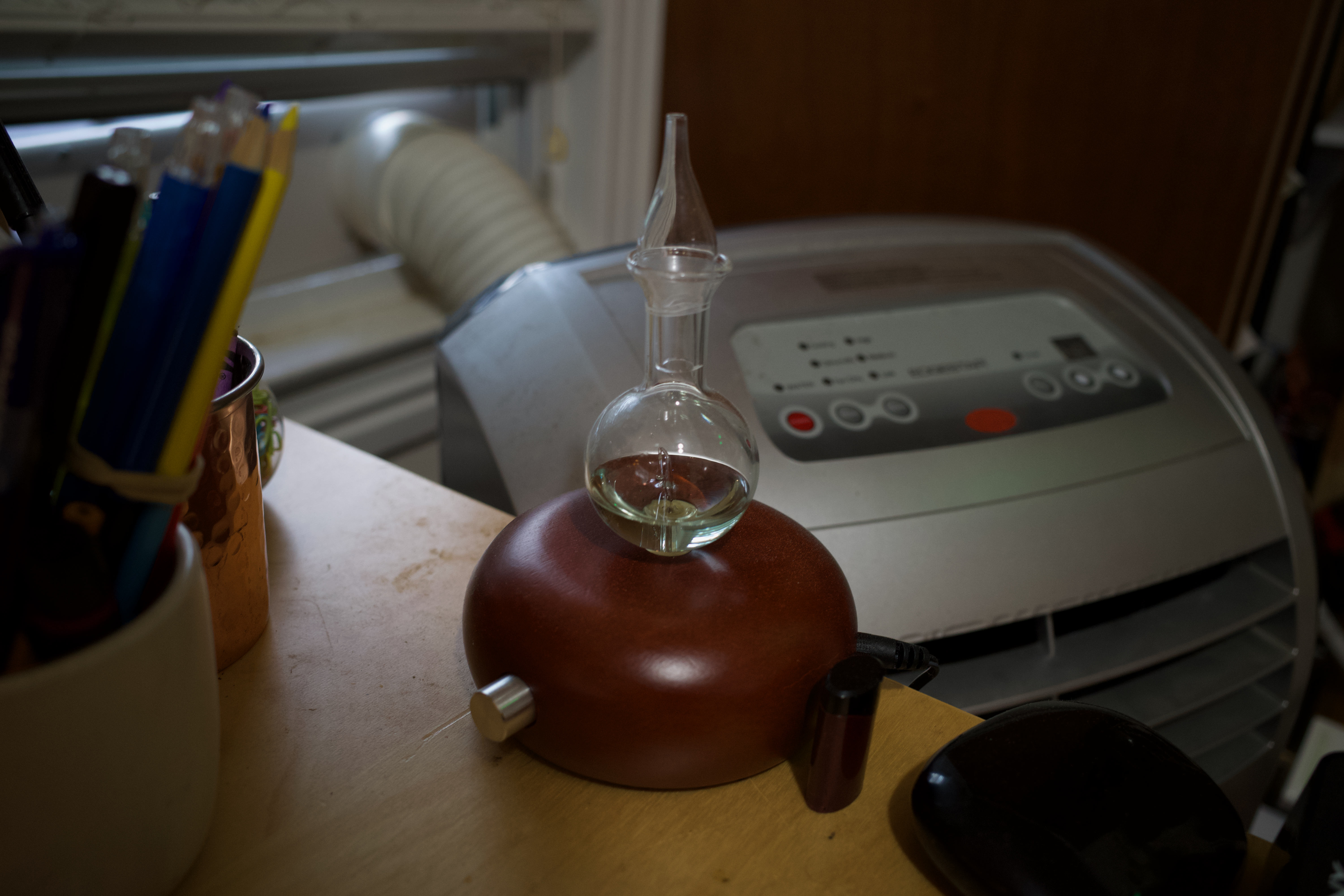 The photograph captures a scientific apparatus resting on a cluttered desk, illuminated by soft, diffused light that highlights the glass and wood textures. The juxtaposition of the delicate glass flask with the robust air conditioning unit in the background creates a mood of contrast between fragility and functionality. The surrounding pens and objects add a personal touch, suggesting a space of creativity and experimentation.