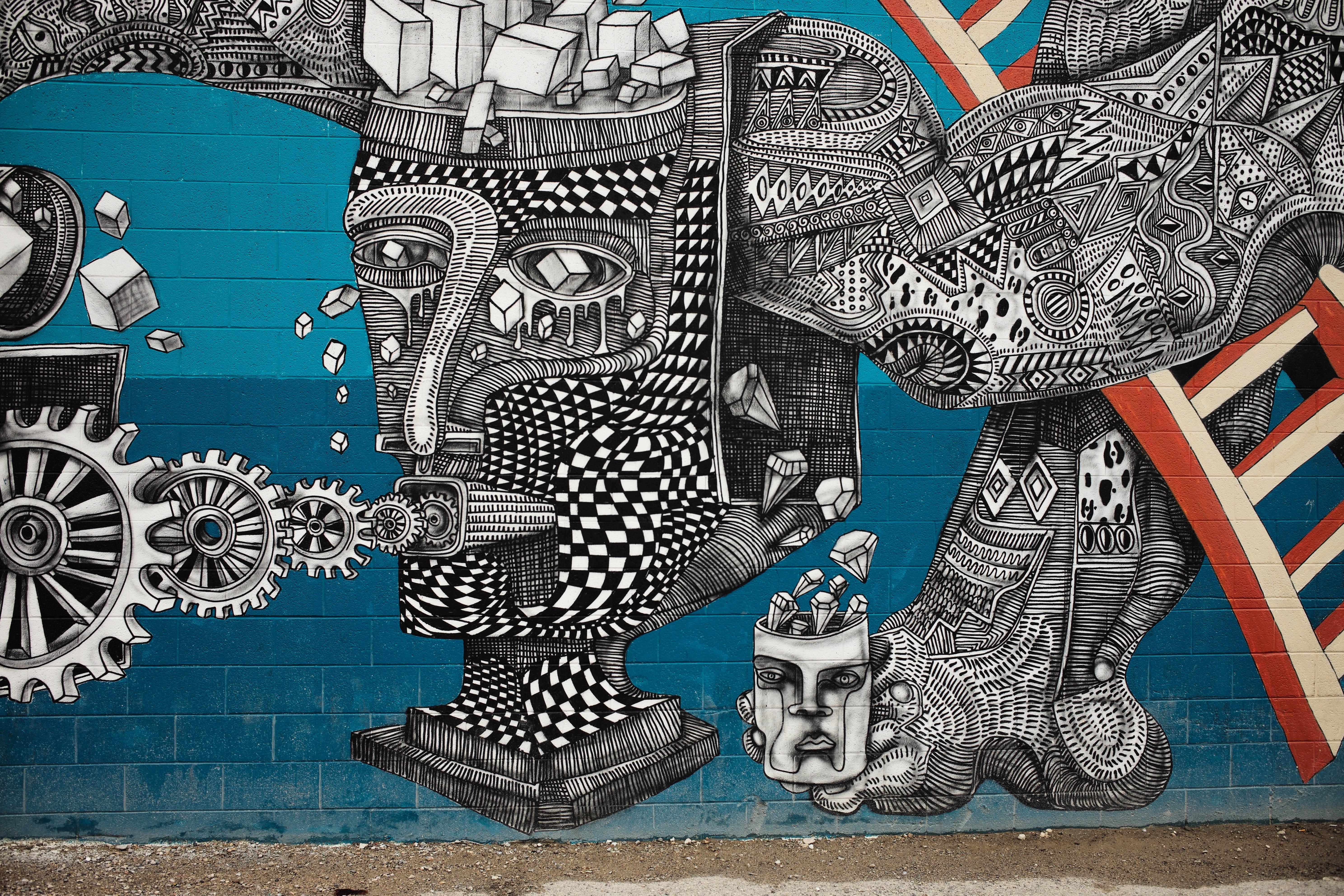 This striking mural showcases an intricate design that seamlessly blends human figures with geometric shapes and machinery. The bold black and white details pop against a vibrant blue background, creating a sense of unity between artistry and technology. The composition evokes a surreal mood, inviting viewers to ponder the interplay between creativity and mechanic ingenuity.