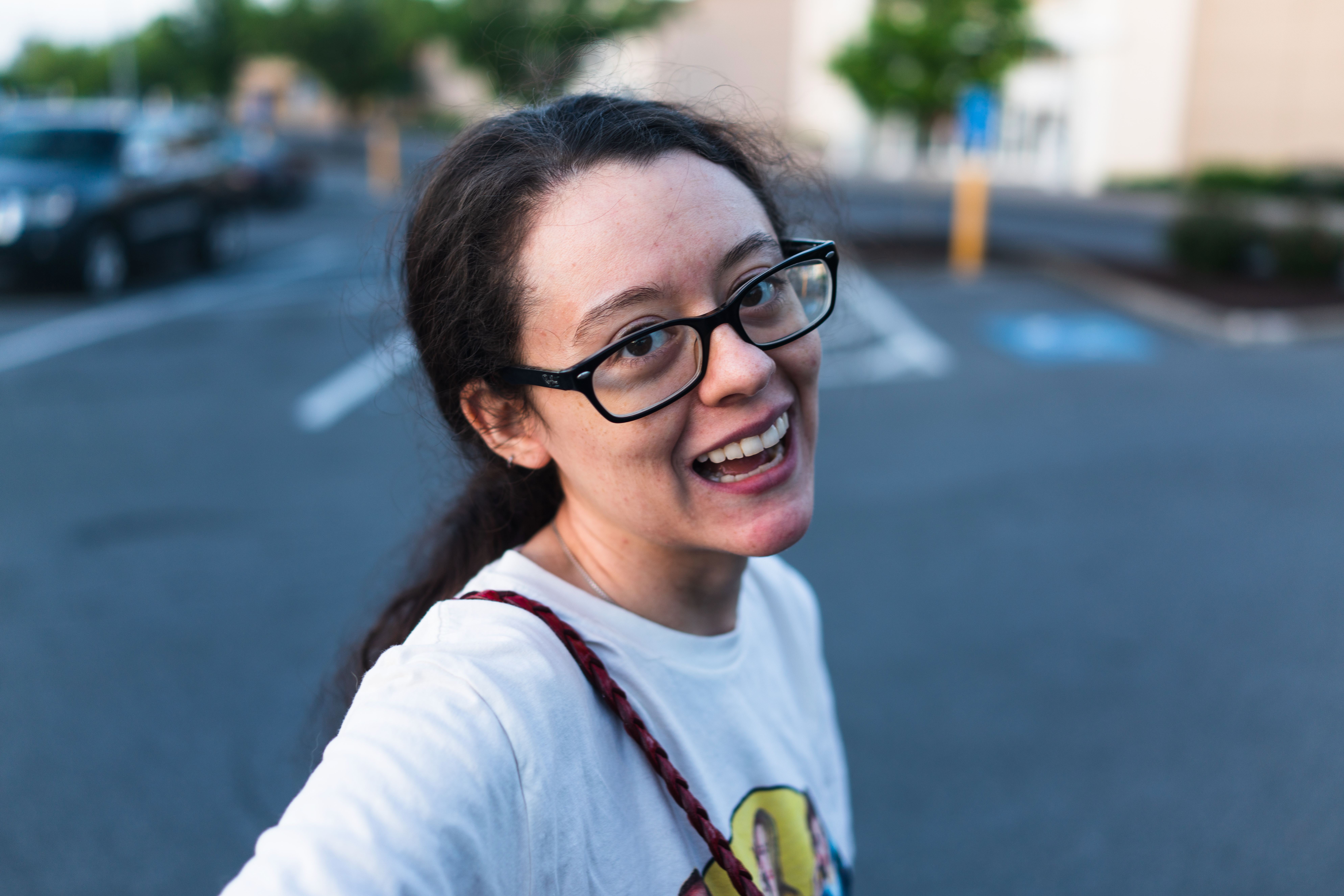 In this vibrant outdoor scene, a young woman flashes a broad smile, exuding a contagious sense of joy and enthusiasm. The composition captures her in a playful angle, with blurred cars and greenery in the background, highlighting her presence amidst an everyday urban setting. The warm lighting accentuates her cheerful demeanor, creating an inviting and lively mood.
