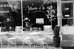 This photograph captures the inviting facade of a quaint café, adorned with whimsical decorations and a cozy outdoor seating area. The monochrome palette adds a nostalgic feel, highlighting the delicate lines of the wrought-iron furniture and the handwritten sign, creating a serene, welcoming mood. Soft shadows and reflections from the window enhance the charm, inviting patrons to pause and enjoy the atmosphere.