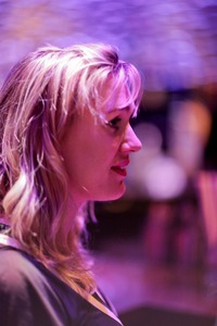 The photograph captures a young woman in profile, bathed in soft purple lighting that creates a dreamlike atmosphere. Her hair softly frames her face, lending a delicate elegance to her expression as she gazes into the distance. The bokeh background, with hints of warm colors, contrasts beautifully against her calm demeanor, enhancing the mood of introspection and serenity.