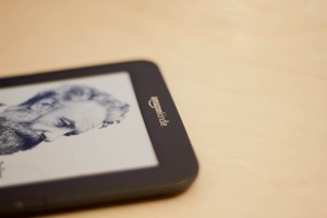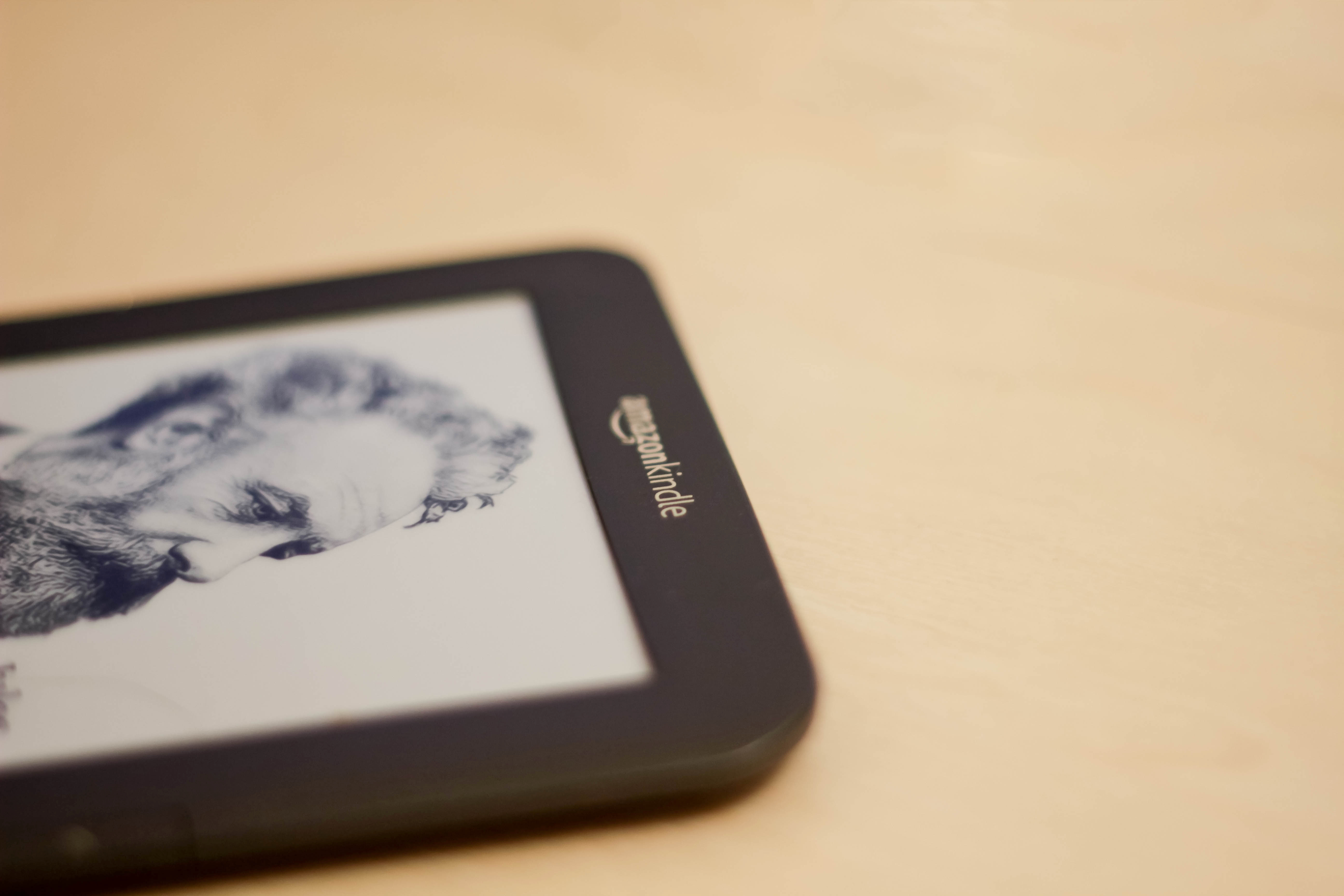 A close-up view of a Kindle, featuring a monochromatic illustration of a bearded man, resting on a soft, wooden surface. The gentle lighting creates a warm and inviting atmosphere, highlighting the device as a bridge between classic literature and modern technology.