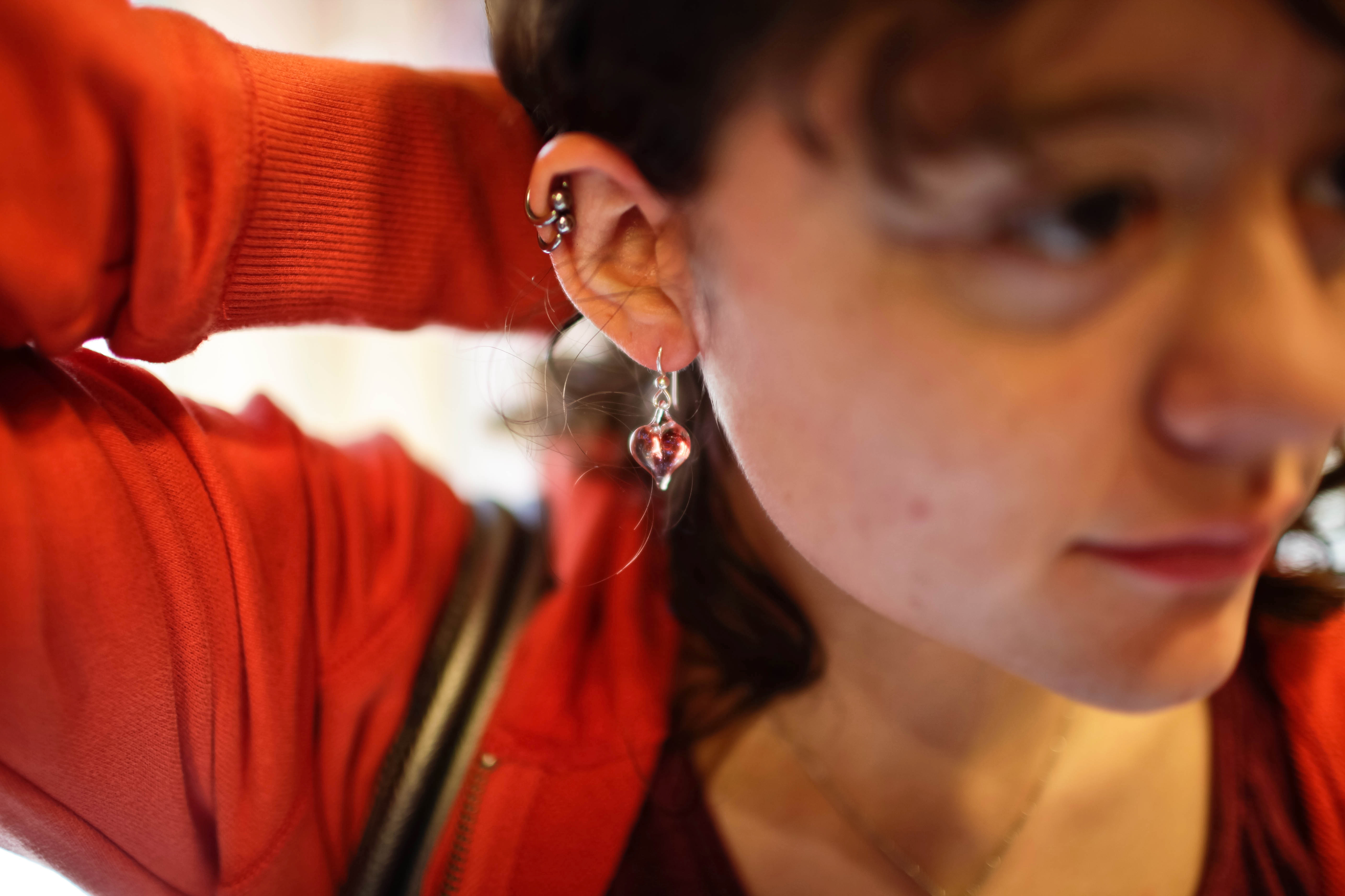 A young woman gazes softly off-camera, adorned with shimmering heart-shaped earrings that catch the light. Her casual red sweater contrasts with a blurred background, creating an intimate atmosphere that highlights her thoughtful expression and the delicate details of her accessories. The warm lighting enhances the warmth of the scene, imbuing it with a sense of connection and charm.