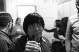 In a lively indoor gathering, a young man gazes upwards thoughtfully, a bottle in hand, amidst the blurred movements of others around him. The black-and-white tones enhance the intimate yet dynamic atmosphere, with soft lighting casting gentle shadows that evoke a sense of nostalgia. The composition draws focus to his contemplative expression, contrasting with the lively background, creating a moment of stillness within the chaos of celebration.