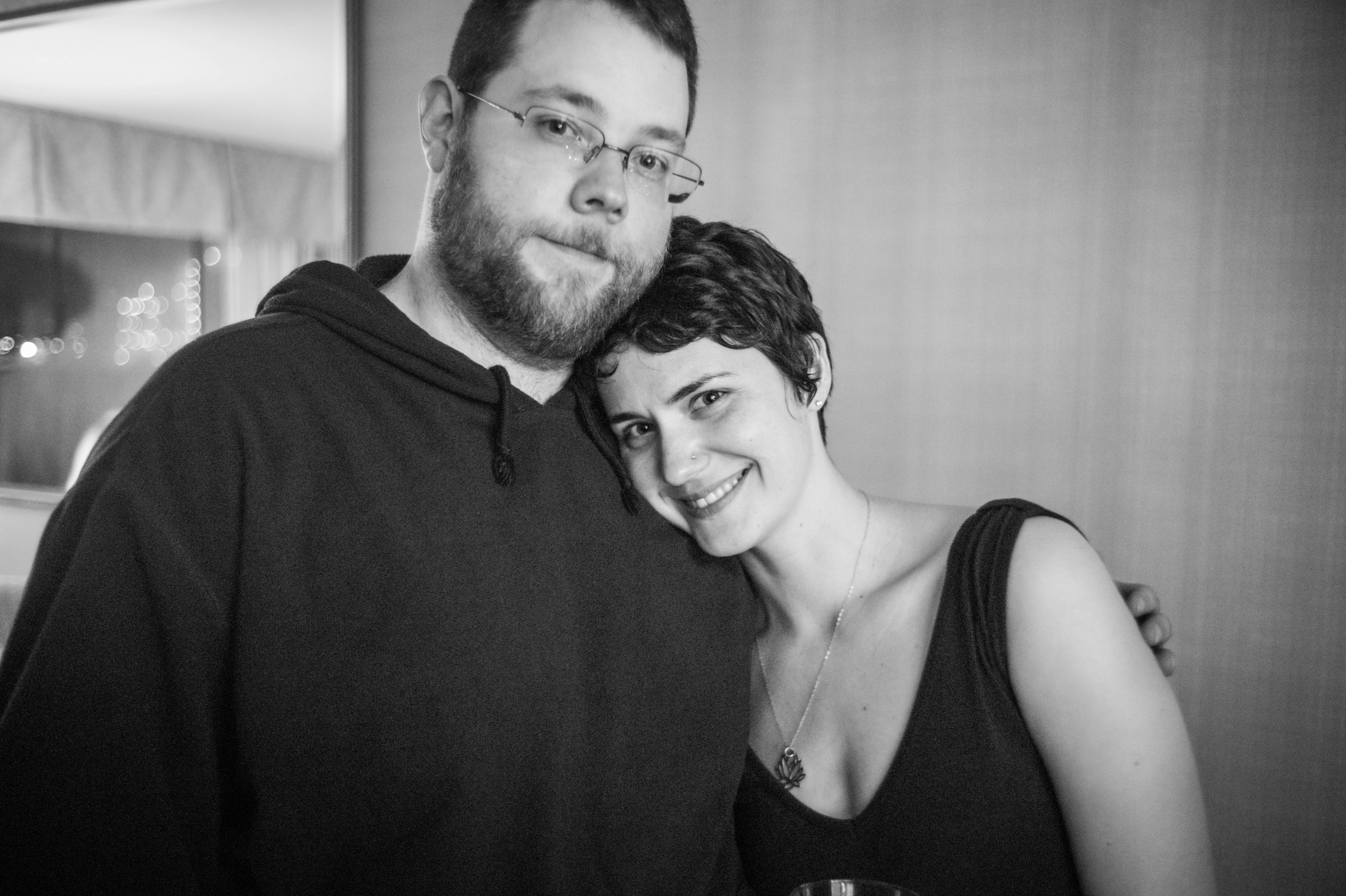 This intimate black-and-white photograph captures a close embrace between two friends, radiating warmth and affection. The soft lighting creates a nostalgic mood, highlighting their genuine smiles and the comfort they find in each other's presence. The composition focuses on their connection, with the background softly blurred, drawing attention to their shared joy.