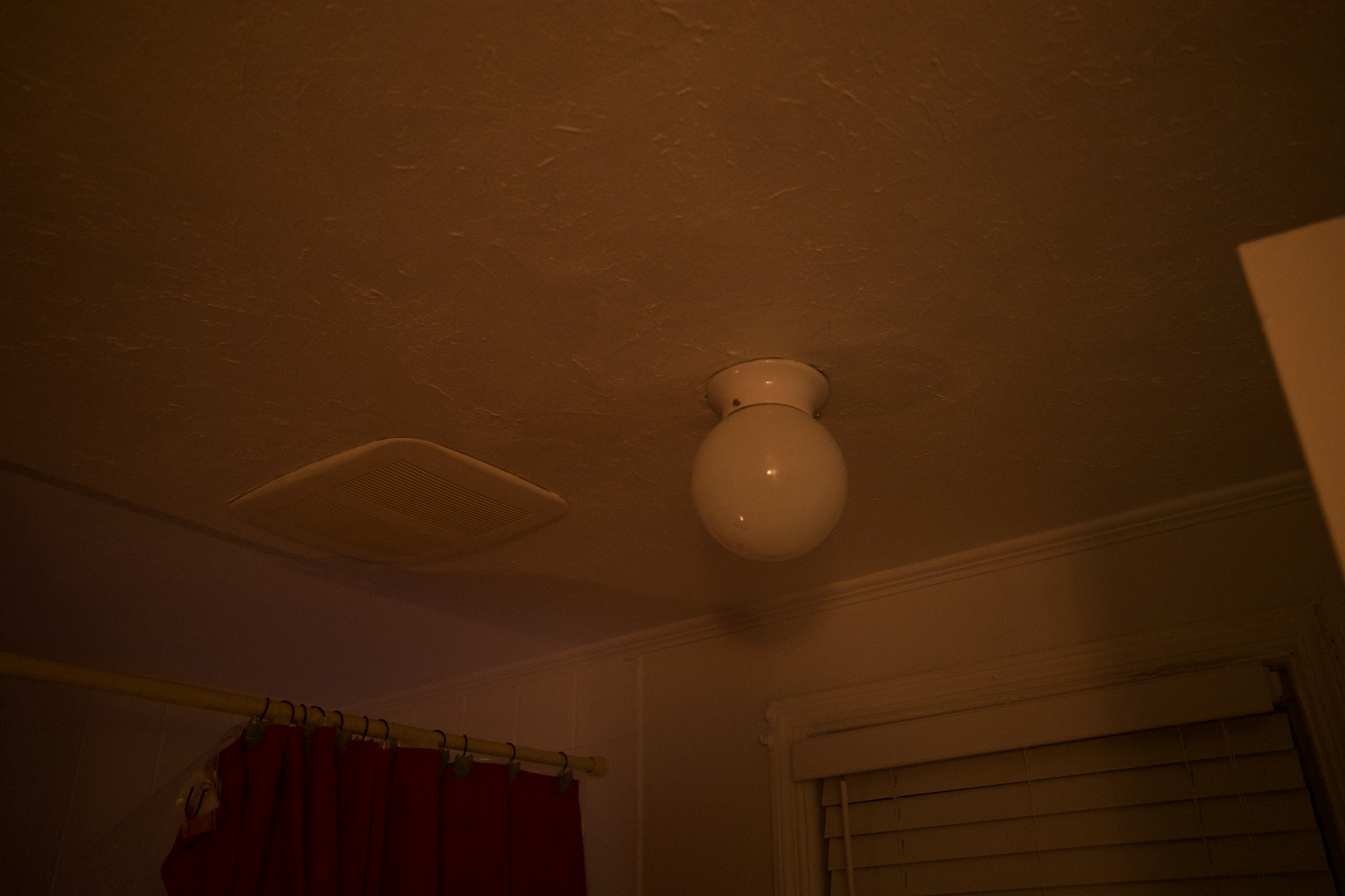 The photograph captures a dimly lit corner of a room, dominated by the soft glow of a round ceiling lamp. Warm hues envelop the space, creating an intimate and slightly mysterious atmosphere, while the subtle textures of the ceiling and walls add depth to the composition. Draped red curtains and closed blinds hint at a private sanctuary, inviting curiosity yet maintaining an air of solitude.