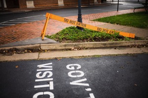 This photograph features a tilted yellow barrier warning "DO NOT ENTER," printed prominently against a muted urban backdrop. The contrast between the bright barrier and the somber, rainy atmosphere creates a feeling of unease and restriction, while the damp pavement reflects a sense of solitude. The composition, with the barrier cutting through a softly lit scene, suggests an unwelcoming invitation to the viewer.