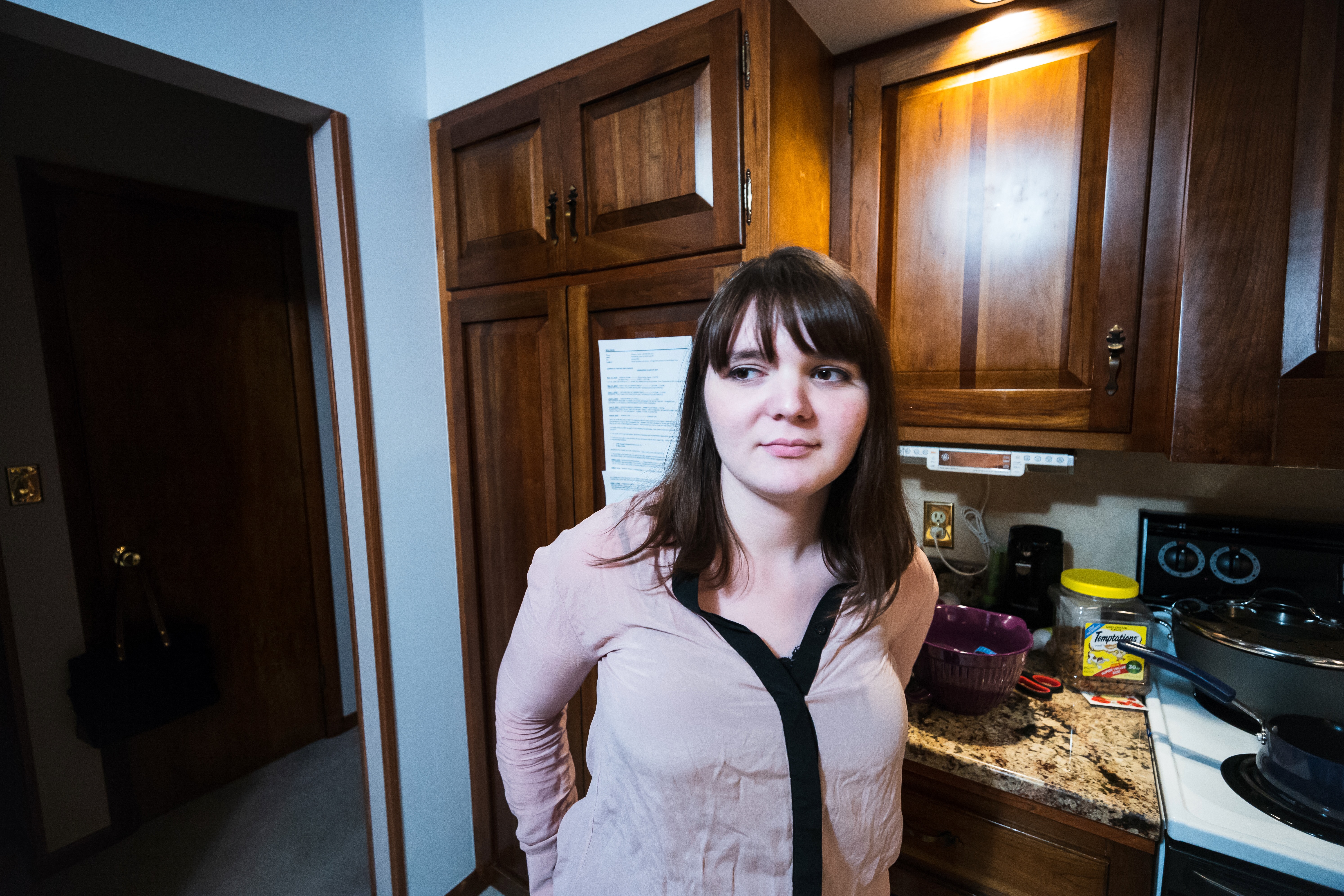In this intimate kitchen scene, a woman stands pensively against wooden cabinetry, exuding a contemplative mood. The warm lighting accentuates her soft features while the cluttered countertop adds a touch of everyday life. The composition draws the viewer's eye, creating a sense of curiosity about her thoughts and surroundings.