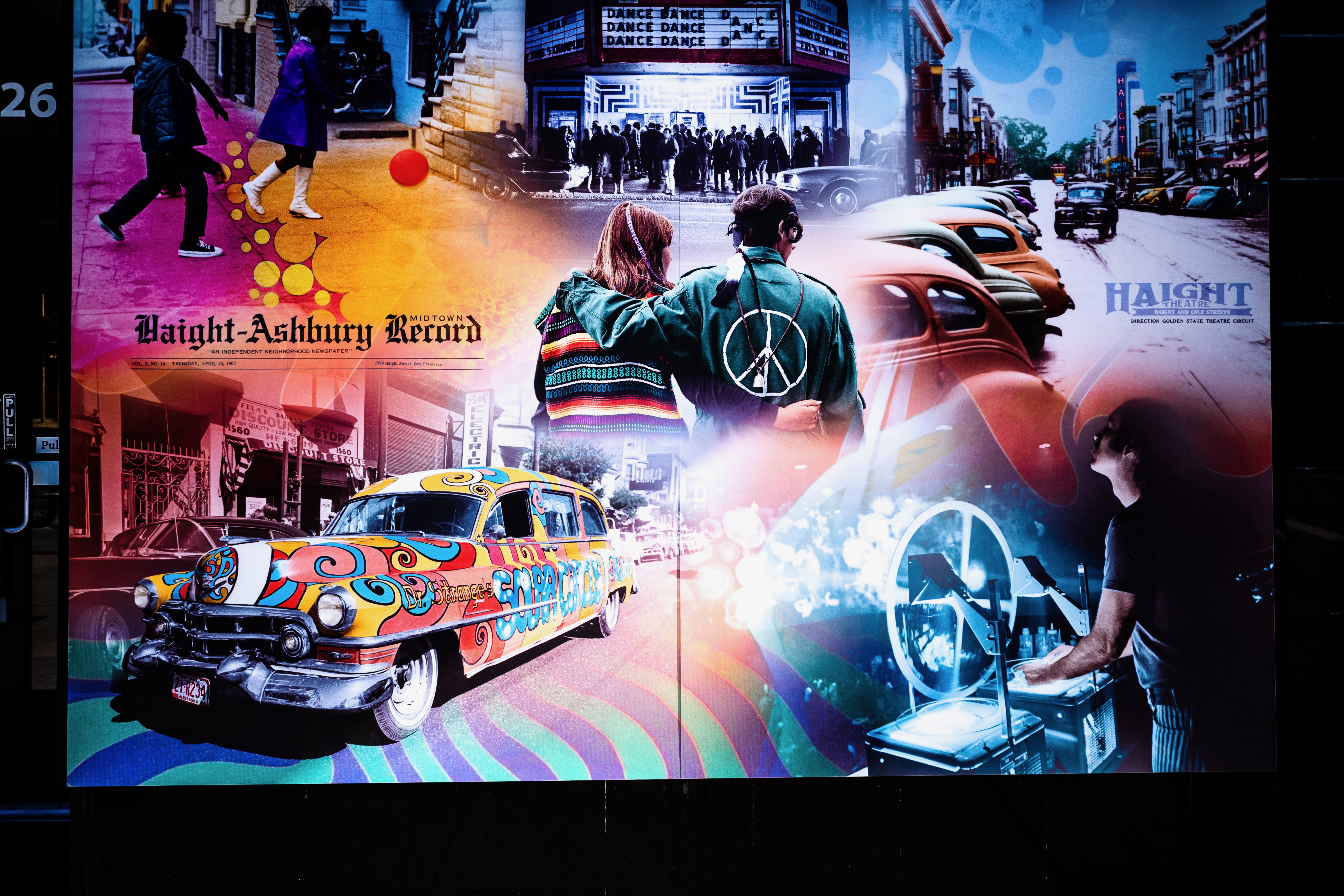 This photograph captures a vibrant mural celebrating the iconic Haight-Ashbury district, filled with psychedelic colors and a collage of 1960s culture. The interplay of lively images, from peace symbols to classic cars, evokes a nostalgic and eclectic mood, highlighting the area’s rich artistic legacy. Soft yet dynamic lighting enhances the vivid hues, drawing the viewer into a colorful historical tapestry.