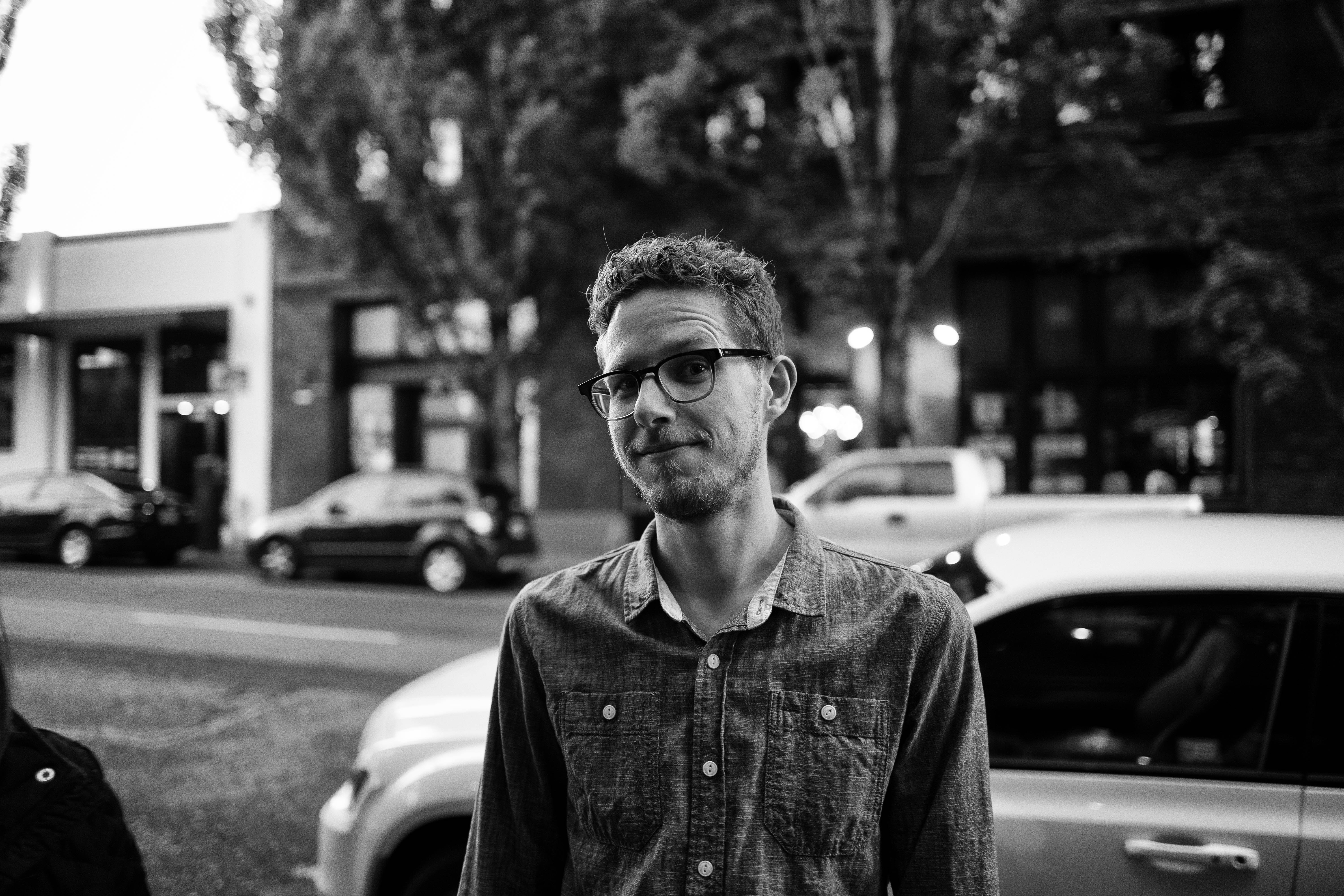 In this candid monochrome photograph, a young man stands at the forefront, his expression a blend of amusement and contemplation. The softened street lights in the background create a moody atmosphere, while the slight blur of passing cars adds a dynamic contrast to the stillness of his pose. The overall composition evokes a sense of everyday life, infused with a touch of introspective charm.