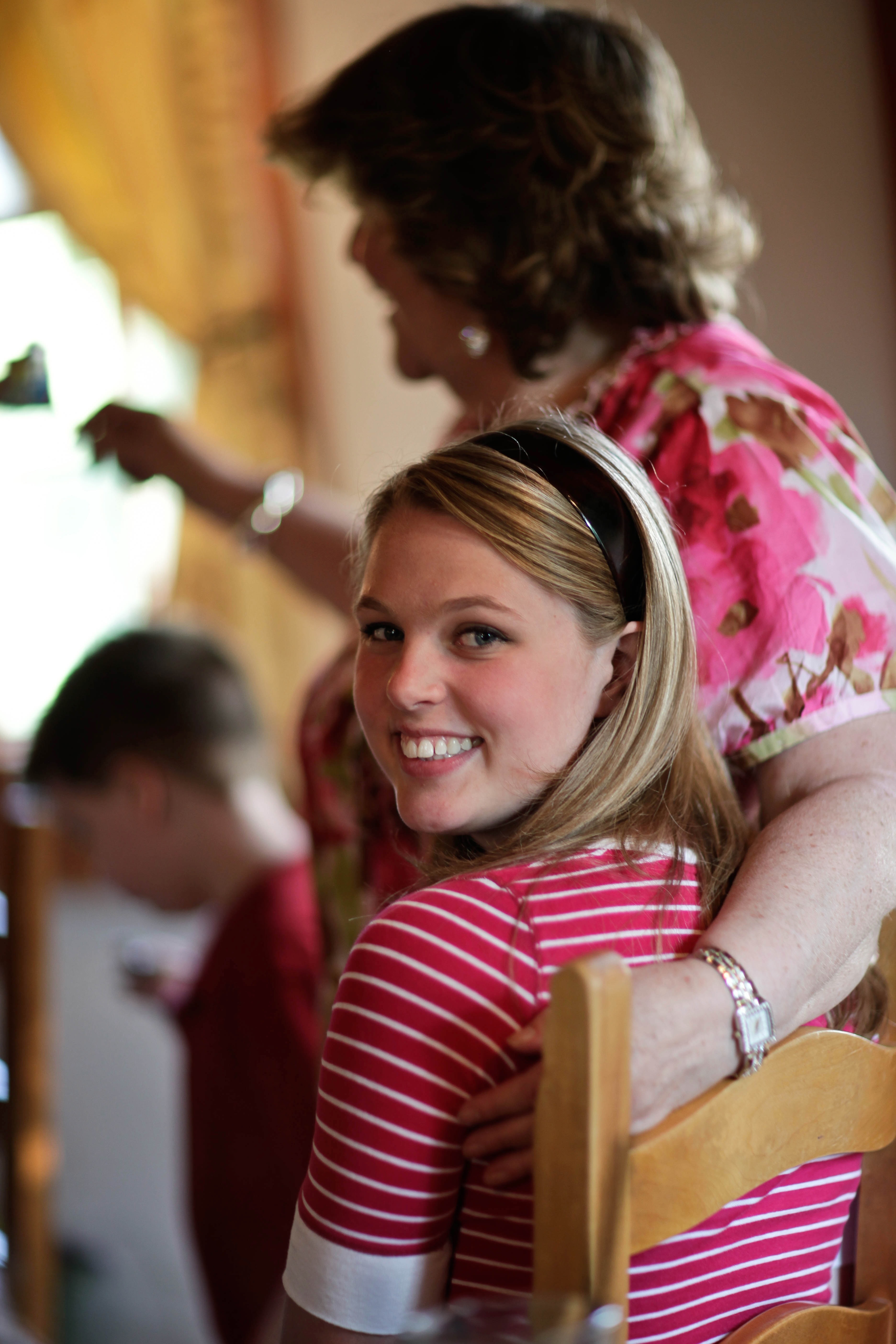 The photograph captures a warm, candid moment of a young woman smiling brightly as she turns to face the camera, radiating joy and connection. In the background, a family member, partially obscured, adds a lively domestic atmosphere, enhanced by soft, natural lighting filtering in through a nearby window. The composition highlights the sense of closeness and shared happiness typical of family gatherings.