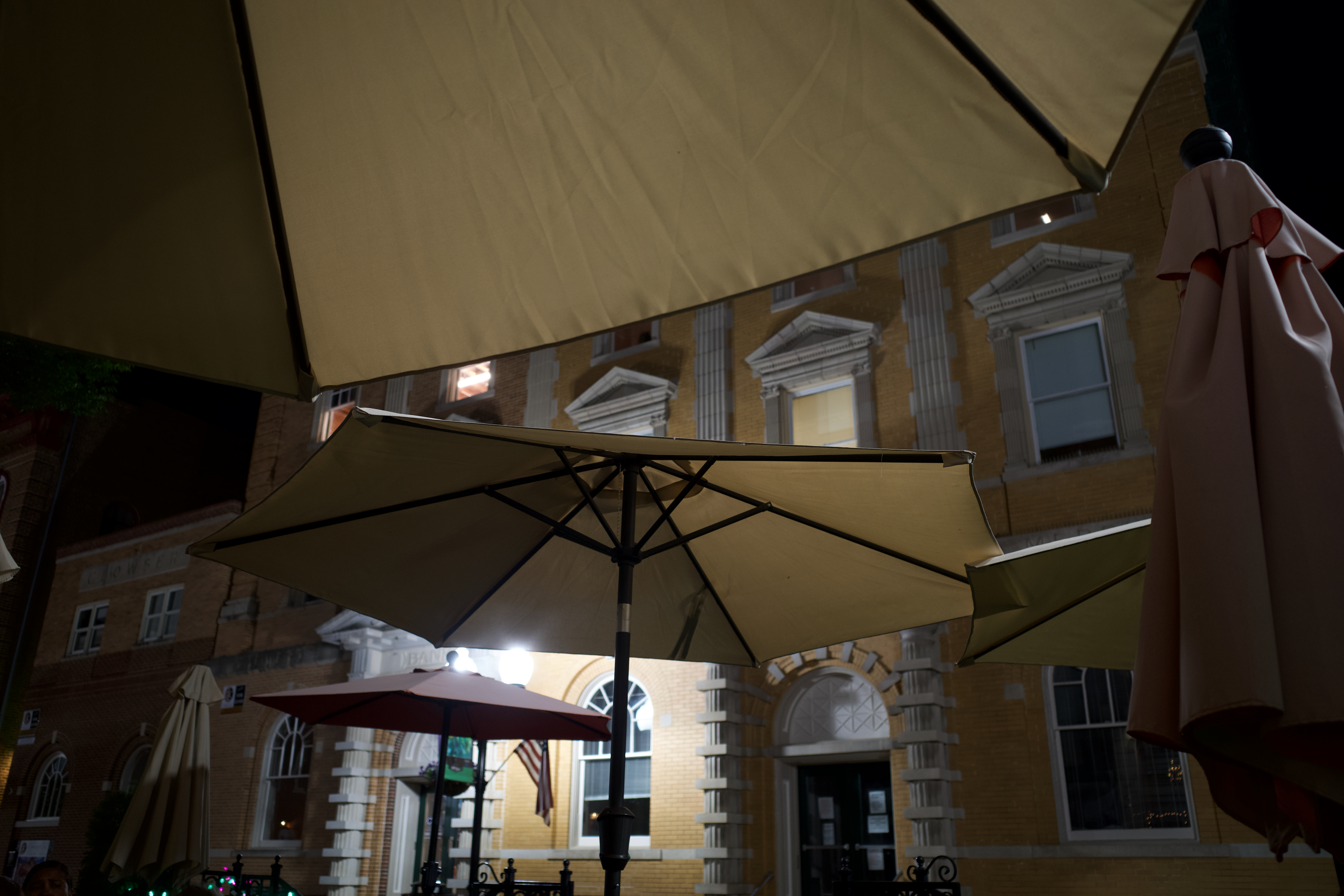 This photograph captures the tranquil ambiance of a nighttime patio, framed by large, neutral-colored umbrellas overhead. The soft glow of lights from the building behind creates a cozy contrast against the dark sky, evoking a sense of warmth and intimacy in an urban setting. The composition draws the viewer's eye upward, highlighting the sheltering canopies while hinting at the inviting space below.