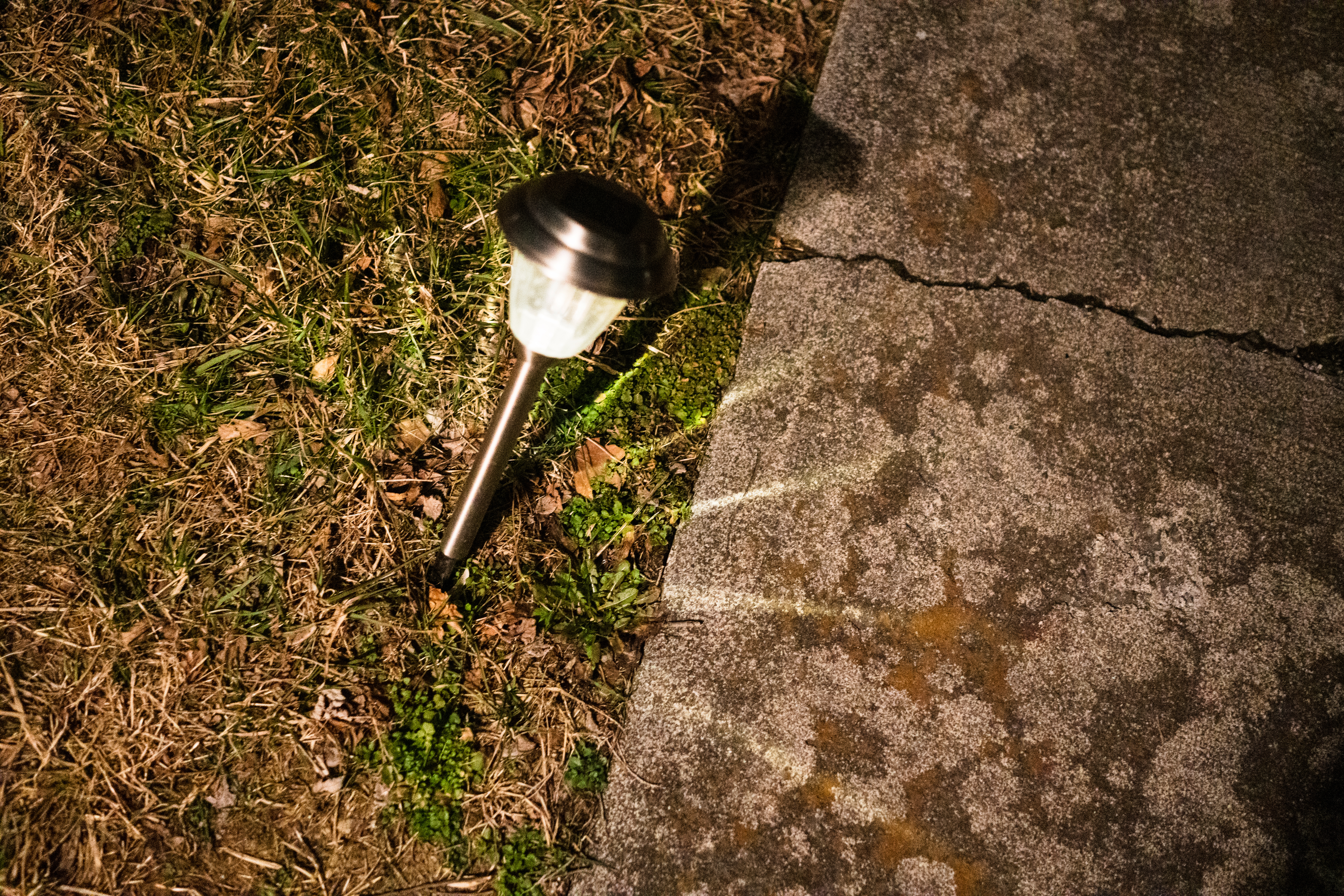 A solitary garden light stands sentinel amidst the dark, damp grass, its soft glow casting gentle shadows on the cracked pavement nearby. The mood is quiet and introspective, evoking a sense of calm in the stillness of the evening. The stark contrast between the light and surrounding darkness enhances the feeling of isolation, inviting viewers to pause and reflect.