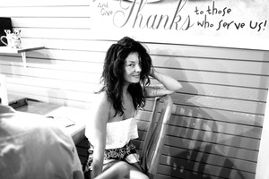 The photograph captures a woman seated against a backdrop that spells out a message of gratitude. Her relaxed pose and playful smile create an inviting and warm atmosphere, while the black-and-white tones add a timeless quality to the moment. Soft lighting emphasizes her features and adds depth to the composition, creating an intimate and engaging scene.