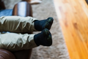 In a snug corner of a living room, a pair of feet clad in black socks rests comfortably against a plush beige carpet, hinting at relaxation. The warm wood tones of the floor contrast with the textured fabric, creating a homely atmosphere. Soft natural light filters in, casting gentle shadows that enhance the intimate mood of the scene.