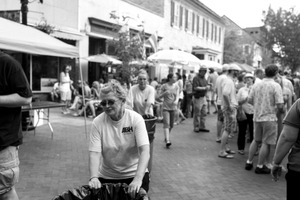 In a bustling street scene, a woman in glasses and a t-shirt pushes a cart, embodying the everyday labor that often goes unnoticed amid lively interactions. The black and white composition accentuates the contrast between her focused demeanor and the vibrant activity surrounding her, conveying a sense of community life that is both energetic and grounded. Natural light casts a soft glow across the scene, emphasizing the warmth of the gathering yet highlighting the woman’s solitary task.