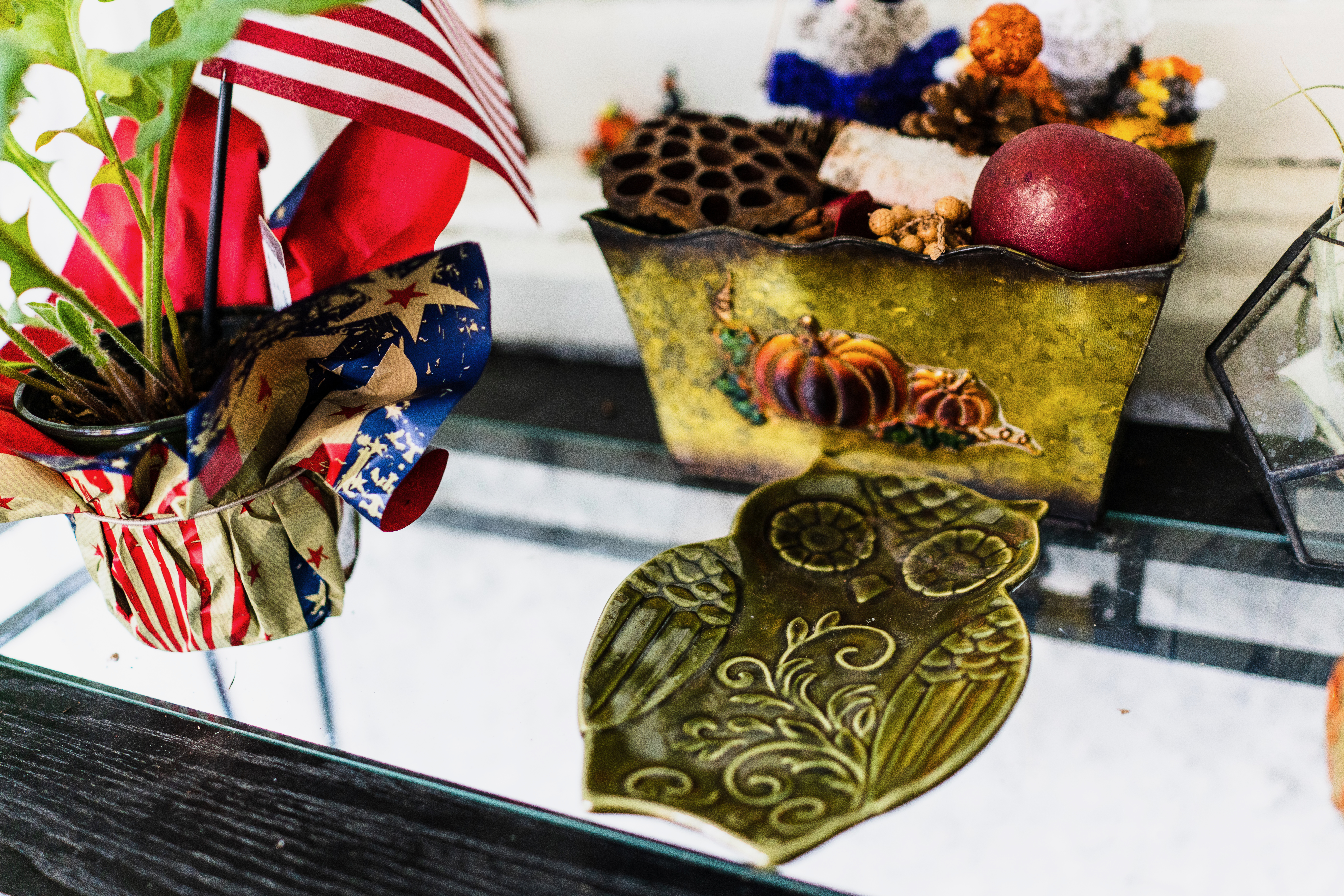 This photograph captures a vibrant display of seasonal decor, featuring a patriotic potted plant and a decorative owl plate. The composition is lively, with rich colors and textures drawing the eye across the various elements, from the bright red and blue of the flags to the warm tones of the autumn-themed container. Soft, natural lighting enhances the cozy, welcoming mood of the scene.
