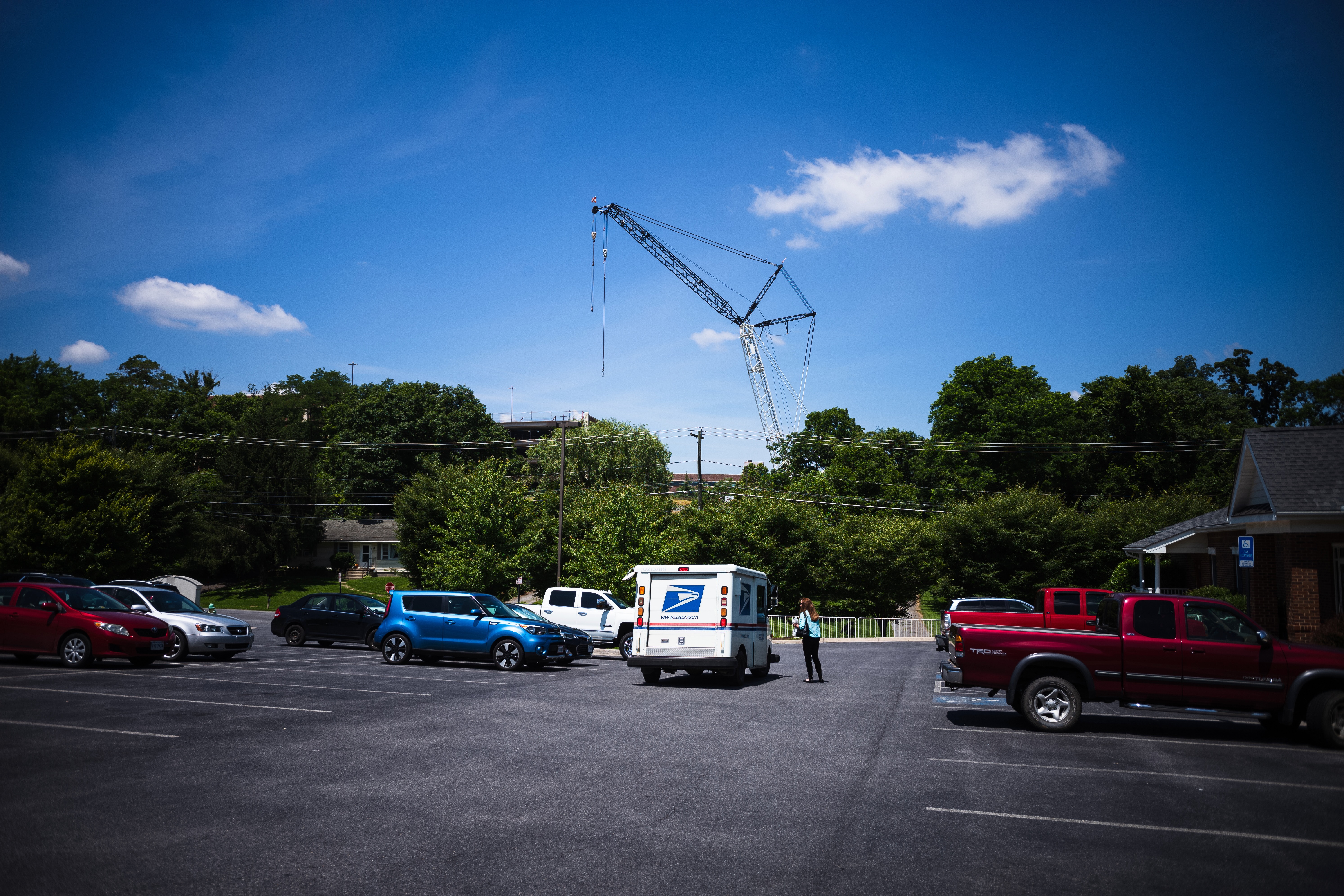 The photograph captures a moment in a parking lot where a postal worker stands near a delivery truck, amidst a backdrop of vehicles and a towering construction crane looming in the distance. Bright blue skies punctuated by soft clouds create a serene yet industrious atmosphere, highlighting the juxtaposition of daily life against urban development. The composition draws the eye from the foreground's parked cars to the crane, suggesting a gradual transformation of the landscape.