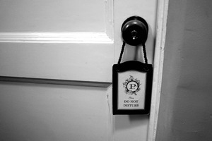 This black-and-white photograph captures a vintage 'Do Not Disturb' sign elegantly suspended from a doorknob, suggesting a moment of privacy and solitude. The stark contrast of light and shadow adds depth to the scene, emphasizing the quiet mystery of the closed door. The composition invites curiosity about what lies beyond, while the inscription conveys a firm yet polite request for seclusion.