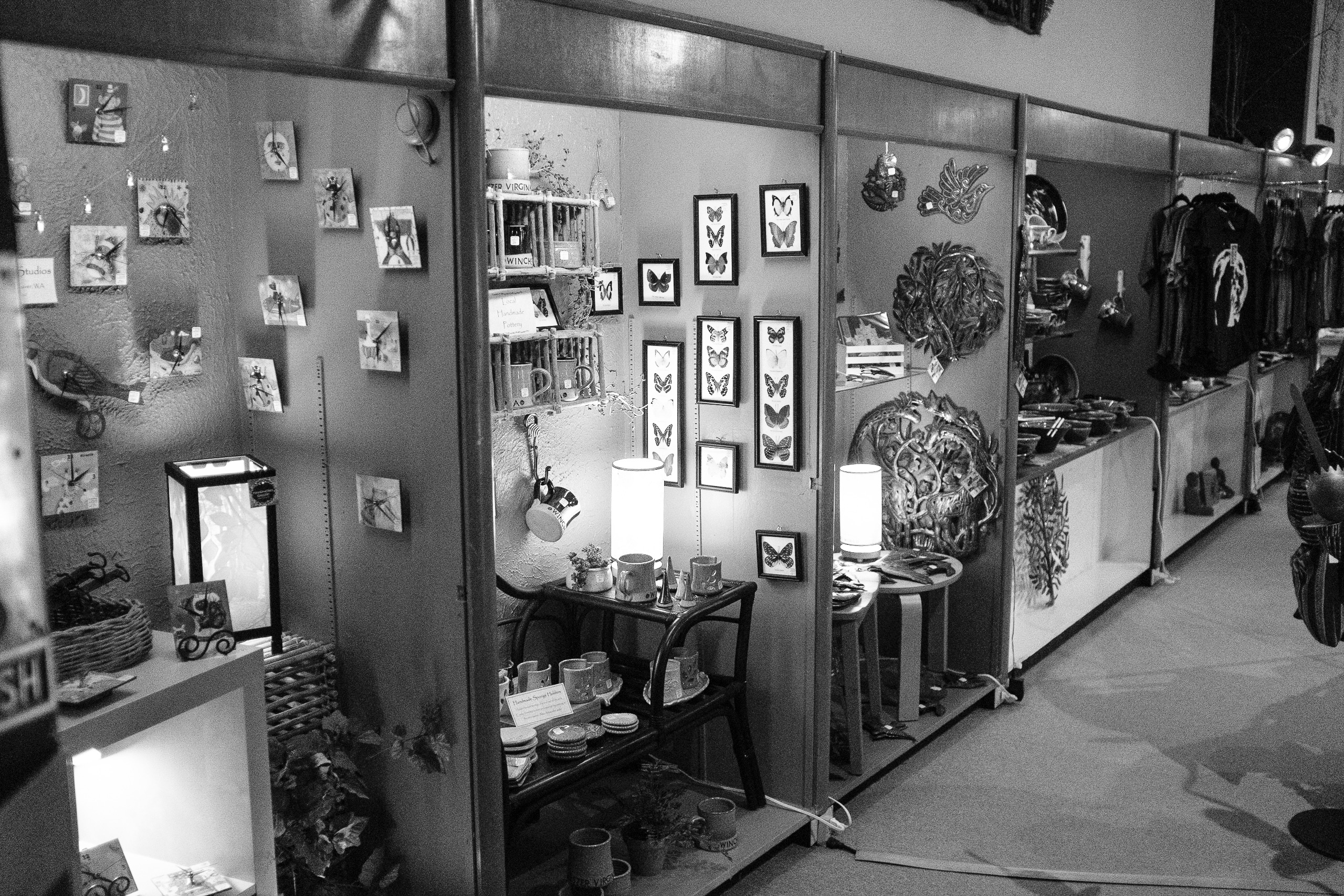 This black-and-white photograph captures a quaint marketplace adorned with various artistic displays. The soft lighting highlights the intricate designs of framed butterflies and other crafts, lending an intimate and nostalgic mood to the scene. The composition draws the viewer's eye along the neat rows of stalls, inviting exploration of the handmade treasures on display.