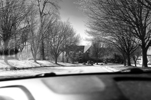 The photograph captures a serene neighborhood scene in black and white, focusing on the empty road framed by bare trees. A large house looms in the background, adding a sense of tranquility and stillness to the composition. The soft lighting enhances the peaceful mood, evoking a sense of solitude and reflection.