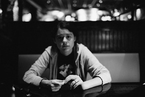 The photograph captures a young person seated alone at a dimly lit table, exuding a sense of quiet introspection. The soft focus around the edges draws attention to their pensive expression, while the high contrast of black and white enhances the mood of solitude. Subtle ambient light hints at a bustling environment beyond the immediate scene, juxtaposing the subject's stillness with the energy of the restaurant.