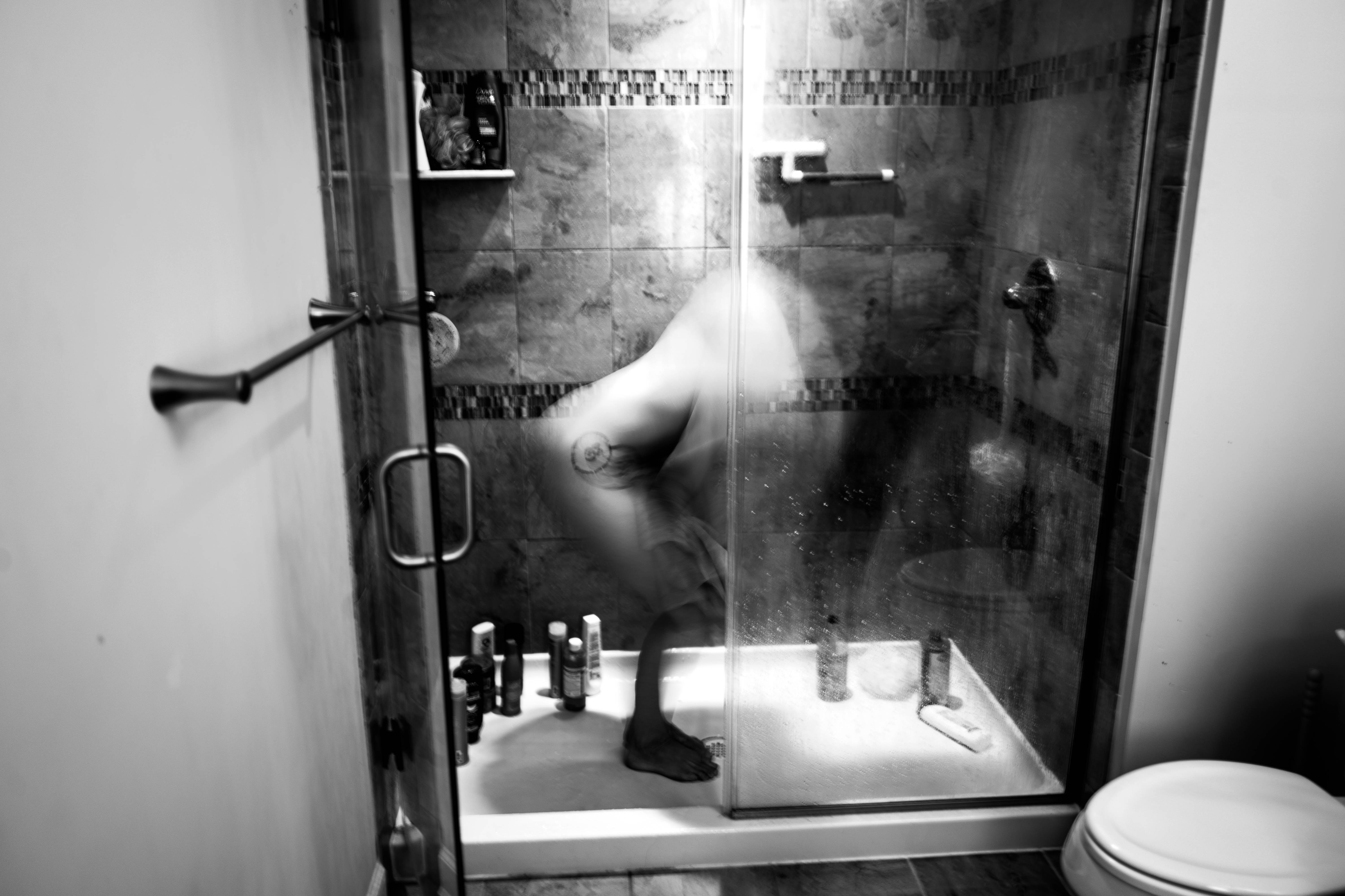 A blurred figure is captured mid-motion inside a shower, emphasizing the theme of fleeting moments. The contrast of light and shadows, combined with a monochromatic palette, enhances the intimacy and vulnerability of the scene. The composition draws the viewer's eye to the subtle details of the bathroom, creating a sense of quiet solitude.