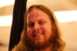 The photograph captures a man with long hair and a beard, grinning warmly against a softly illuminated backdrop. The gentle lighting enhances the inviting atmosphere, creating a sense of intimacy and relaxation. His relaxed expression conveys a mood of friendliness and openness, inviting connection with the viewer.