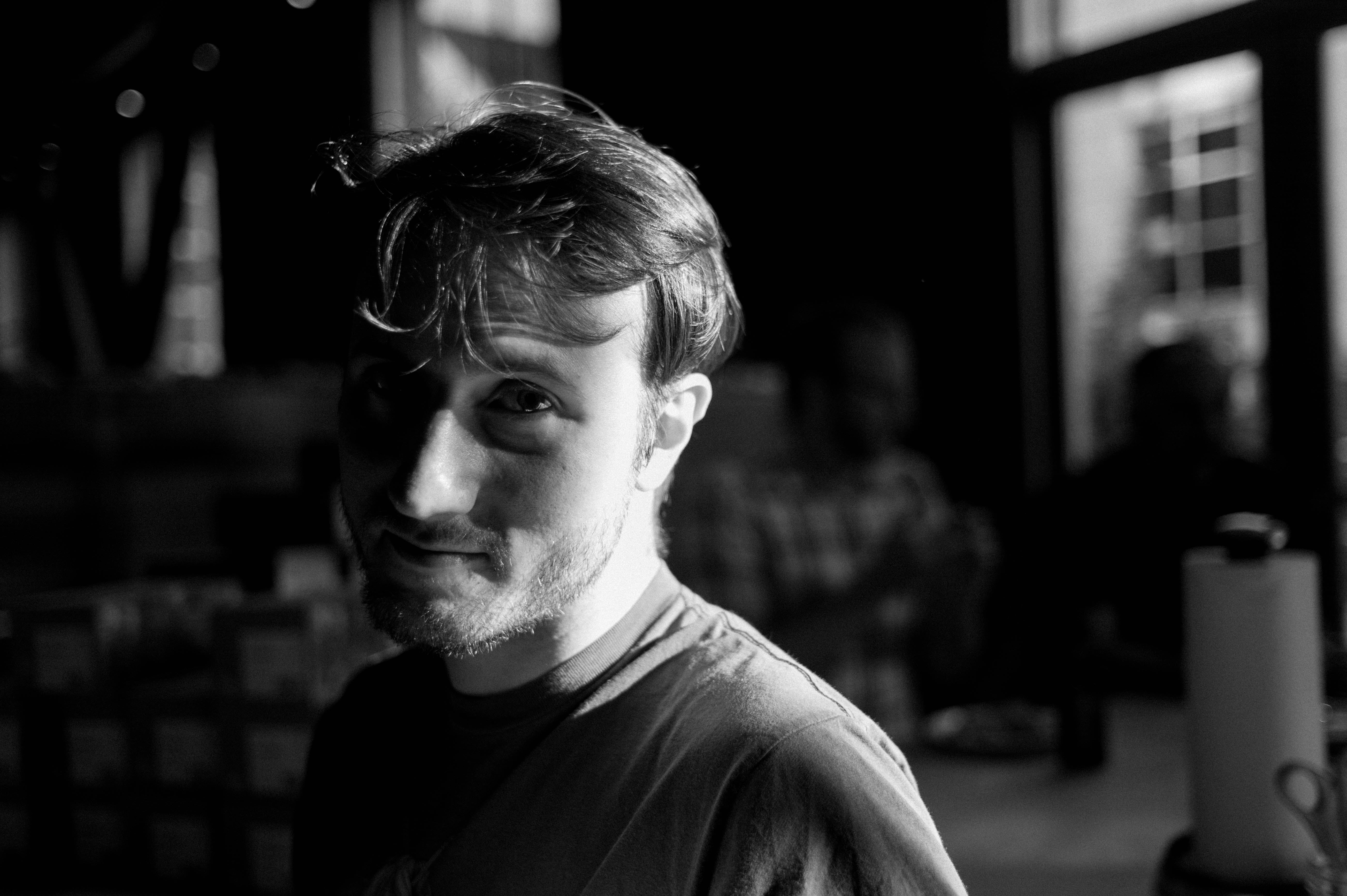 In this black-and-white photograph, a young man looks softly over his shoulder, illuminated by a singular light source that highlights his features against a dim background. The play of light and shadow creates a moody atmosphere, drawing viewers into his contemplative expression. The composition is intimate, with the blurred outlines of others in the background adding depth and a sense of shared space.