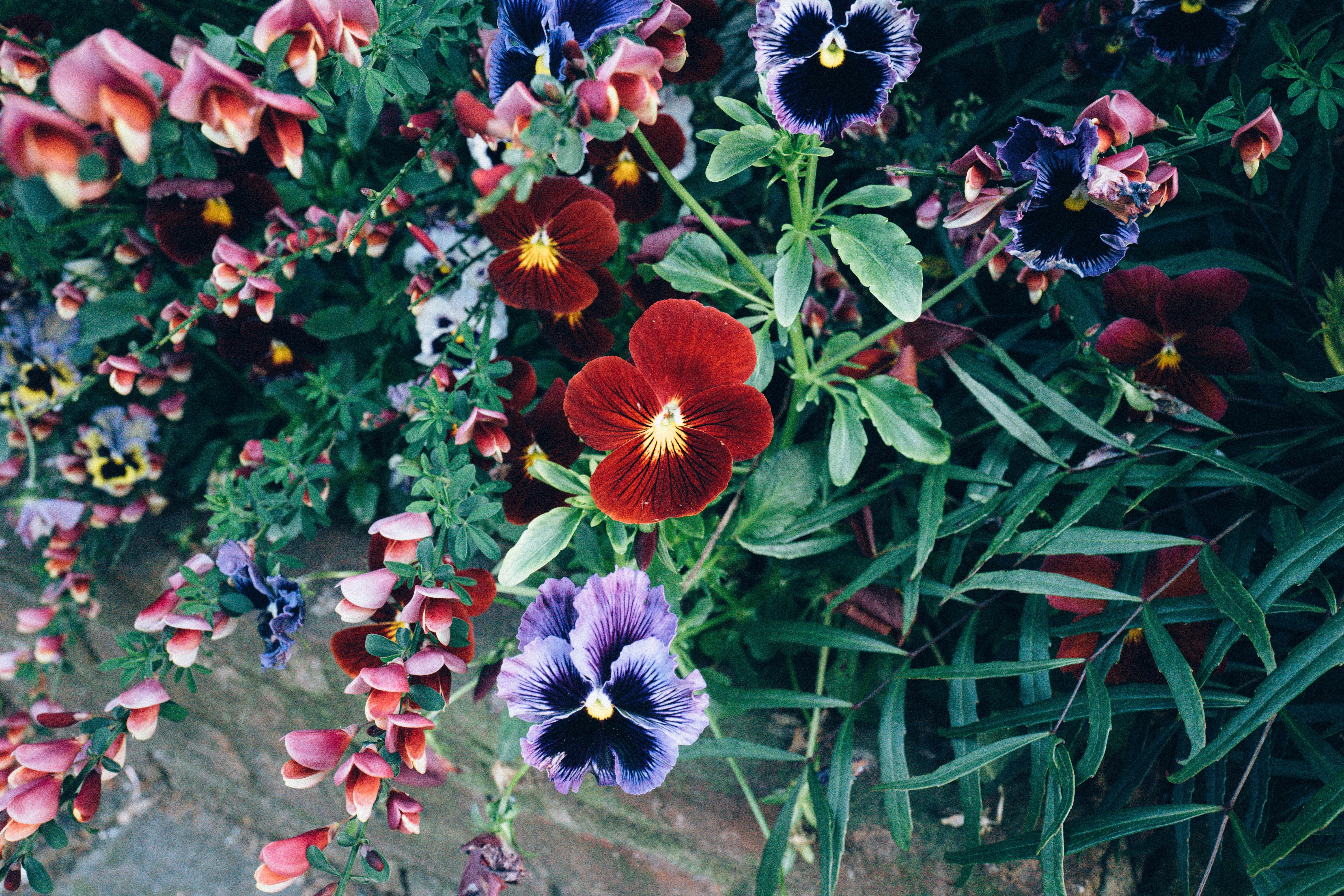 A vibrant array of flowers fills the frame, showcasing lush reds, deep purples, and delicate pinks, intermingled with verdant greens. The balanced composition draws the eye through the rich colors, evoking a sense of joy and serenity, as sunlight gently bathes the scene in a warm glow. This floral tapestry invites viewers to pause and appreciate the beauty of nature in its myriad forms.