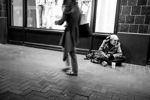 The photograph captures a poignant moment in a bustling urban setting, where a solitary elderly man sits on the pavement, embodying vulnerability amid the indifference of passersby. With stark contrast created by the ambient lighting, the scene evokes a sense of isolation, as a blurred figure strides past, highlighting the disparity between their worlds. The monochrome palette further enhances the emotional depth, urging the viewer to reflect on the weight of societal neglect.