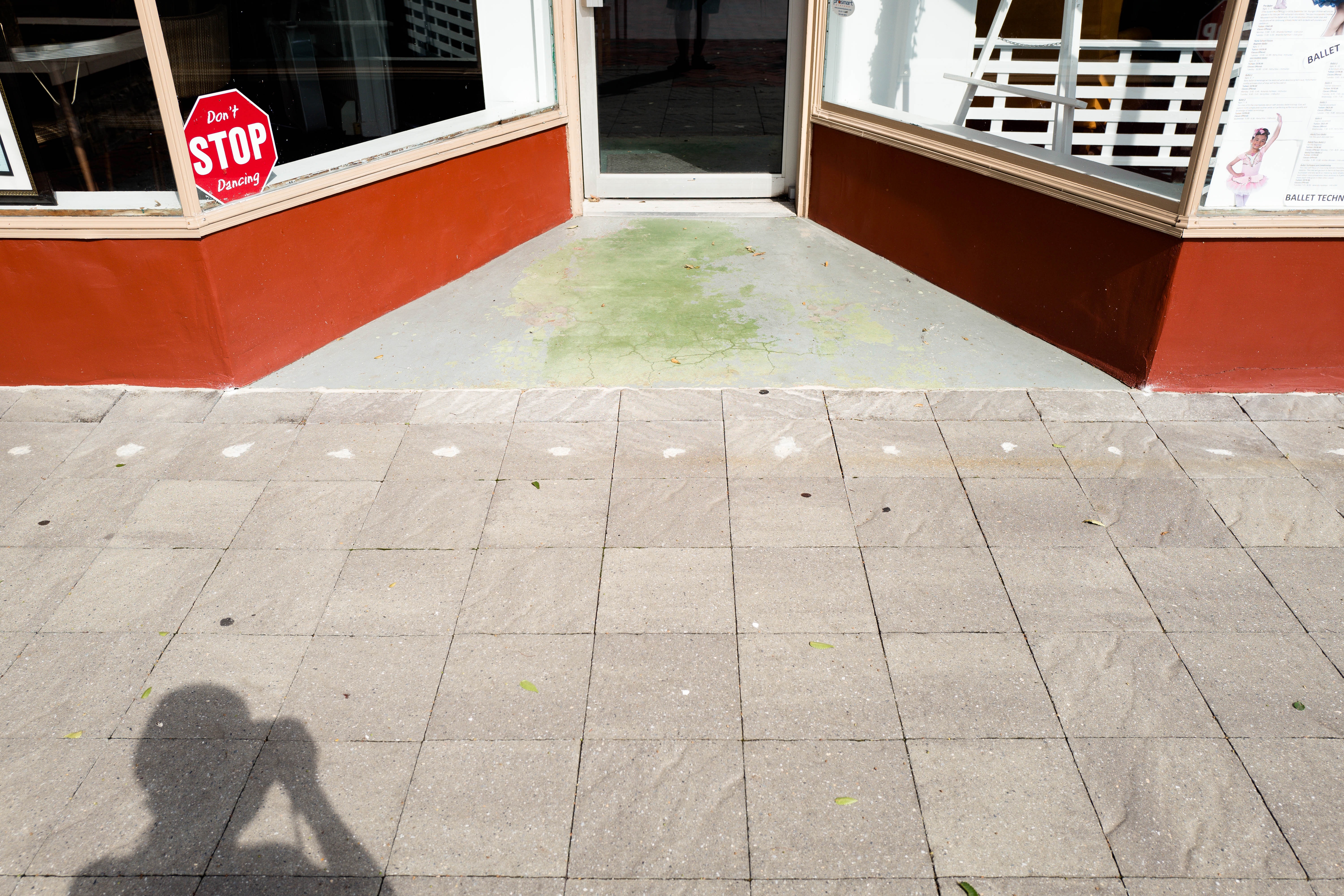 The photograph captures a quaint entryway, marked by a playful 'Don't STOP Dancing' sign that invites a sense of whimsy. Sunlight spills over the textured pavement, creating a bright, cheerful ambiance that contrasts with the subtle green stains on the floor. The composition draws the viewer’s eye toward the door, hinting at stories waiting to unfold inside.