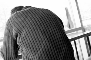 The photograph captures a man leaning against a railing, seen from behind, clad in a textured, ribbed sweater. The soft, natural light filtering through the window contrasts with the deep shadows, creating a mood of introspection and solitude. The composition emphasizes the lines and contours of the sweater, drawing attention to the subject's contemplative posture against a blurred backdrop.