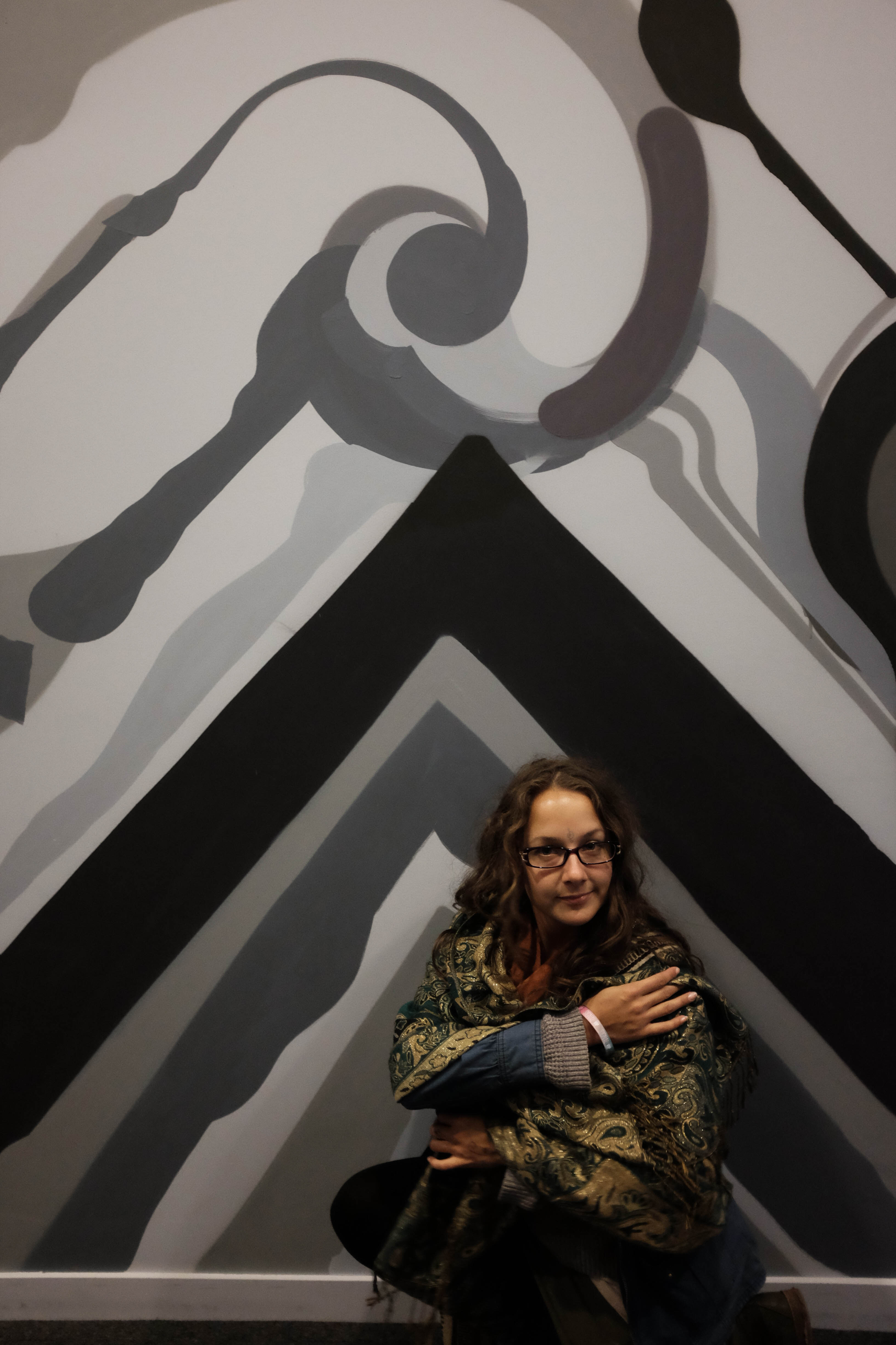 The photograph captures a woman crouching against a striking geometric mural, enveloped in soft hues of gray and black. The serene expression on her face contrasts beautifully with the dynamic patterns of the background, creating a contemplative mood. Warm light gently illuminates her features, enhancing the texture of her shawl and adding depth to the scene.