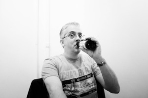 In a minimalist setting, a man sits casually while drinking from a bottle, his expression a mix of contemplation and enjoyment. The monochromatic tones add a nostalgic and timeless quality to the image, enhancing the relaxed atmosphere. Soft, diffused lighting gently highlights his features, allowing him to stand out against the stark white background.