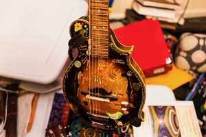 A colorful mandolin adorned with playful stickers and handwritten notes commands attention in a cluttered room. Its rich wood grain contrasts with the vibrant decorations, creating a lively and nostalgic atmosphere. The warm lighting highlights its character, inviting viewers to appreciate the stories held within each detail.