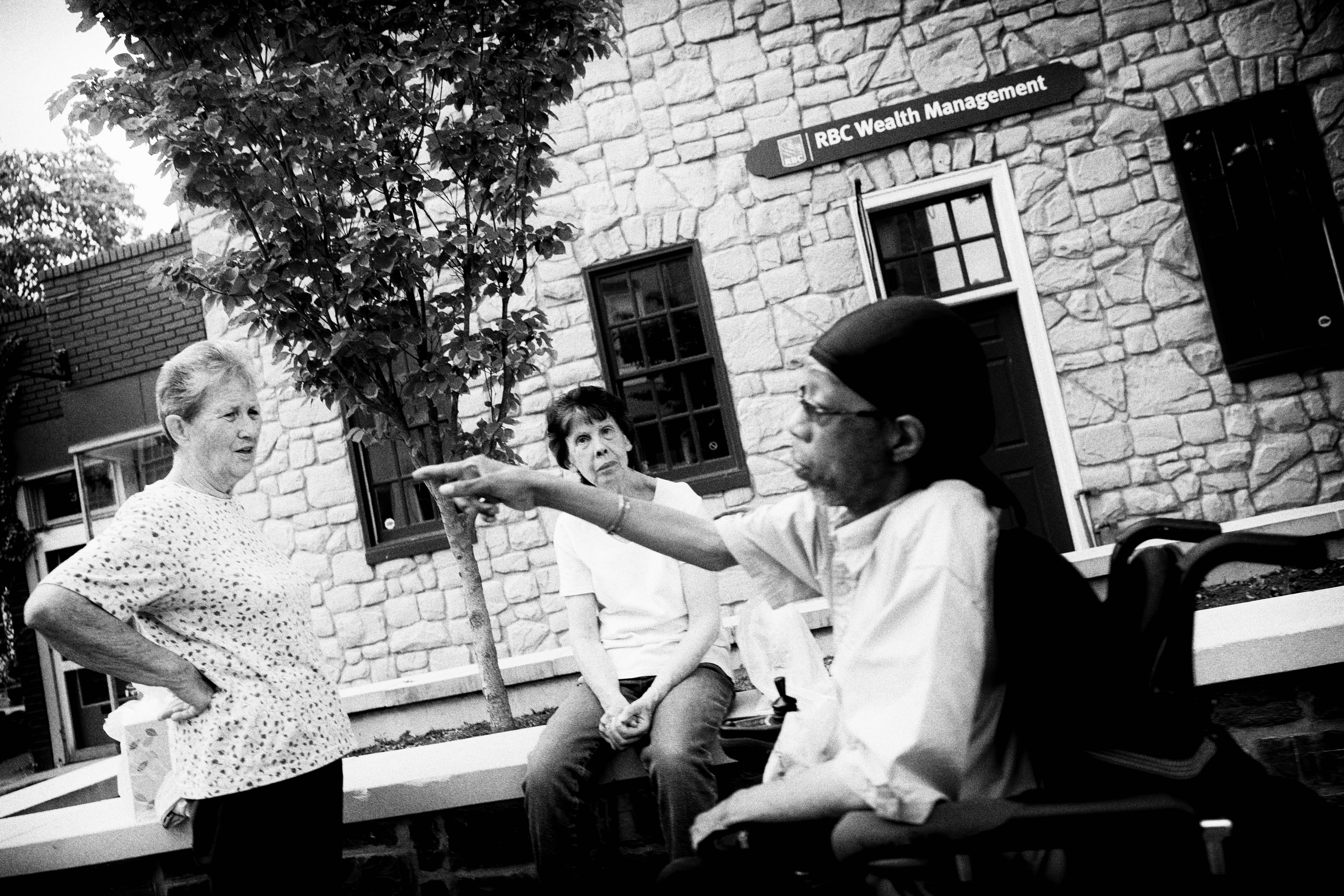 In a striking black-and-white composition, three individuals engage in conversation, their expressions revealing a blend of curiosity and contemplation. The soft lighting casts gentle shadows, enhancing the emotional depth of their interaction, while the textured stone wall behind them adds a sense of timelessness to the scene. The atmosphere feels intimate, inviting viewers to ponder the stories that lie within these shared moments.