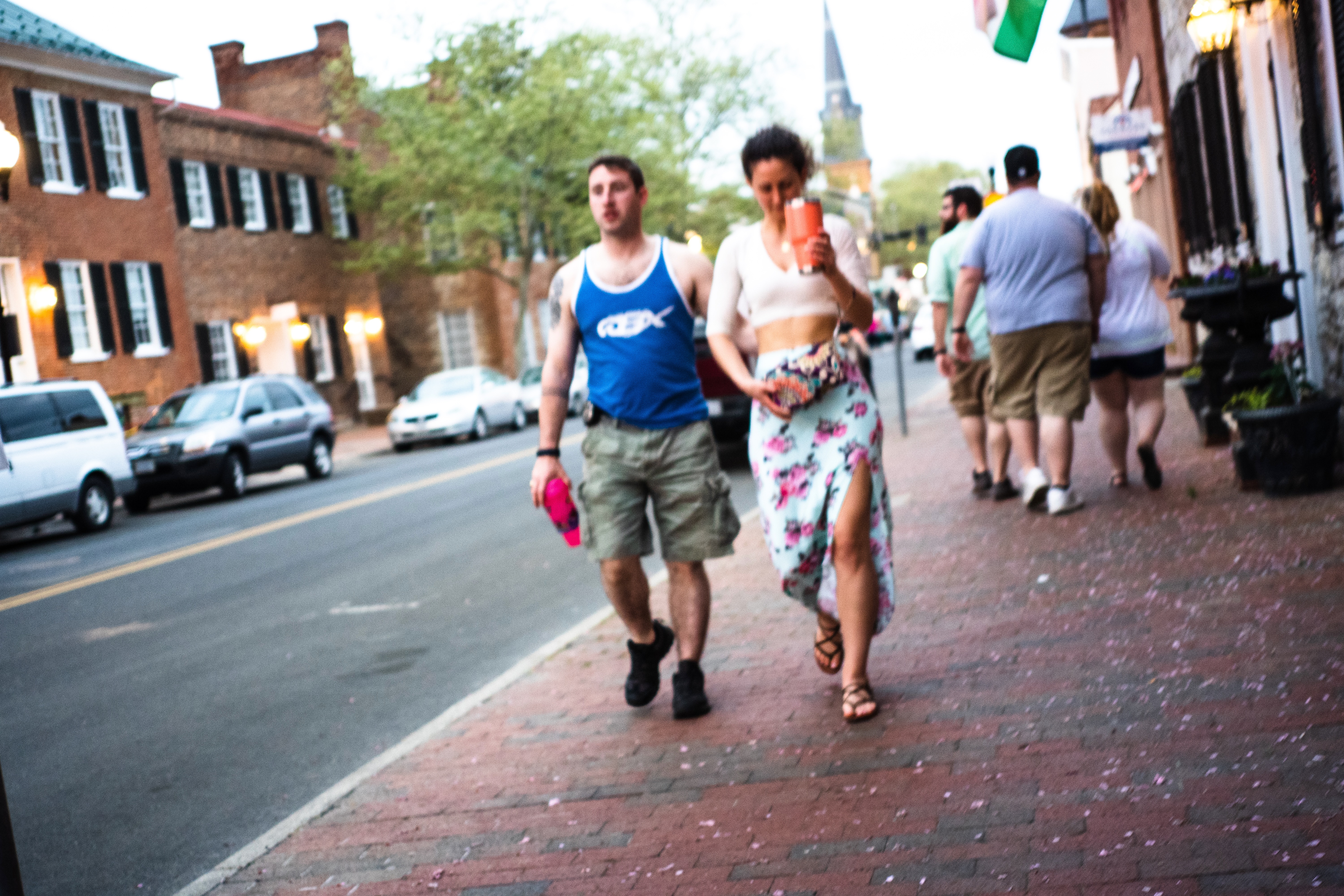 A couple walks side by side down a charming brick-lined street, their casual attire reflecting a relaxed, vibrant atmosphere. The warm glow of street lamps contrasts with the fading daylight as cherry blossom petals litter the ground, hinting at the arrival of spring. The scene captures a moment of leisure and connection amidst the historic backdrop.