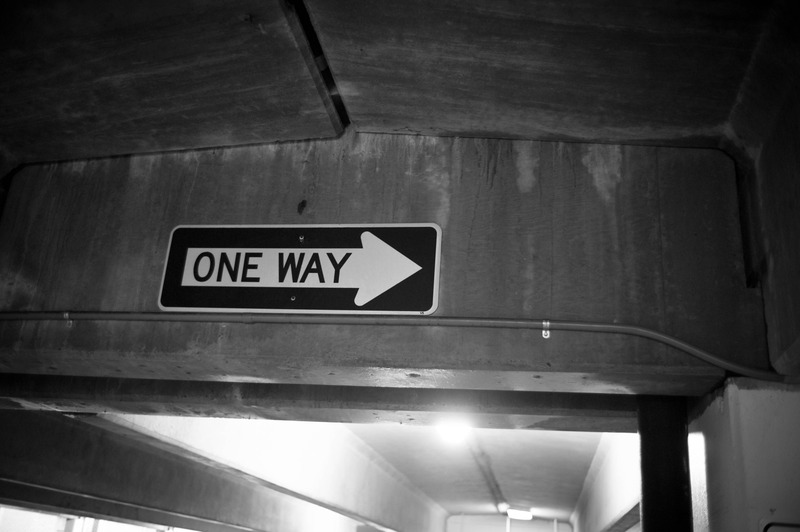 A stark black and white photograph captures a prominent 'ONE WAY' sign positioned above a dimly lit passageway. The concrete textures and subtle lighting create a moody atmosphere, highlighting the solitary direction of the sign while evoking a sense of isolation and contemplation. The composition draws the viewer's eye toward the sign, inviting thoughts on the importance of guidance in a seemingly desolate environment.