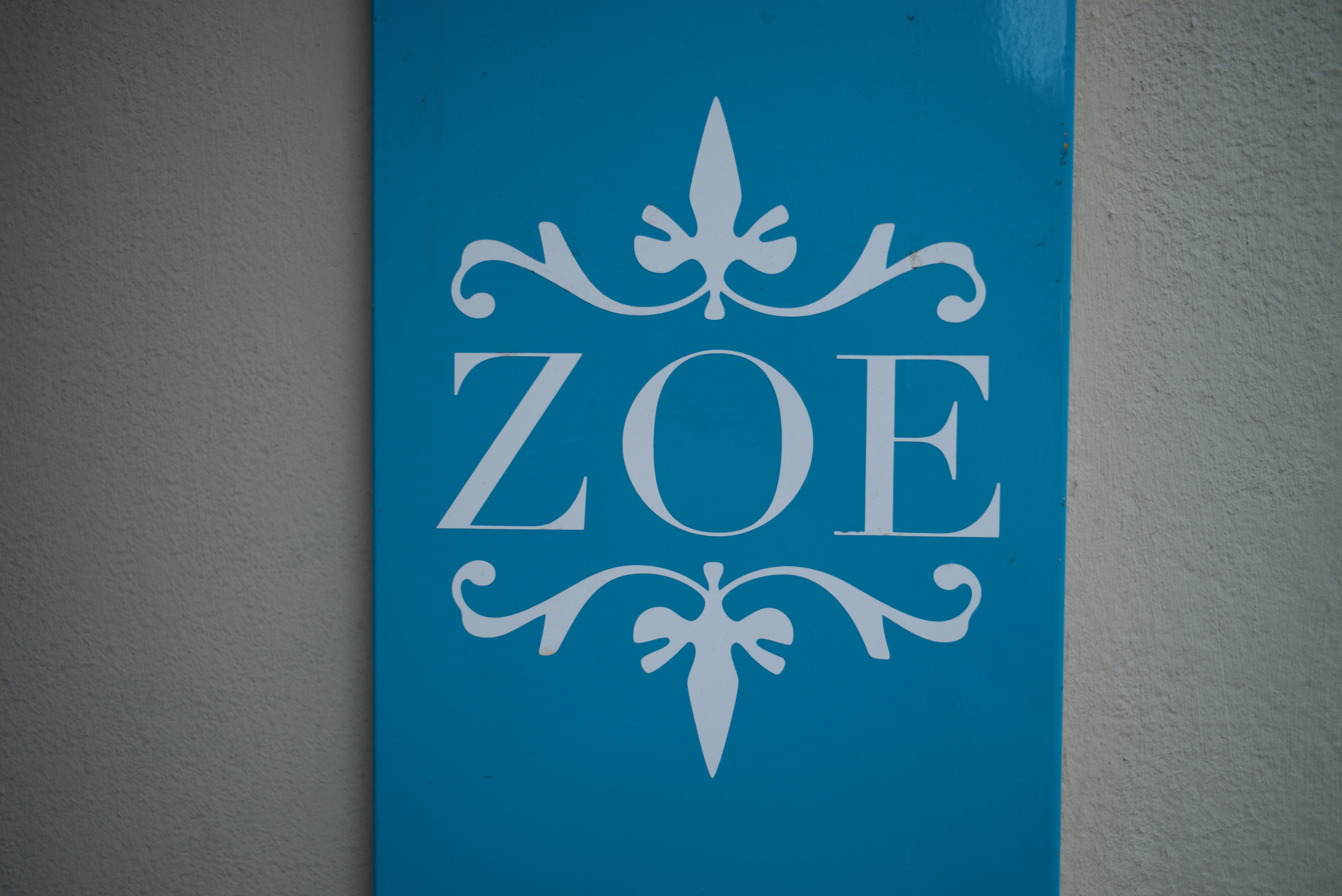 The photograph captures a striking blue sign featuring the name 'ZOE' prominently displayed in bold, elegant white letters. Intricate floral motifs frame the text, creating a sense of sophistication and charm. The soft lighting highlights the smooth finish of the sign, enhancing the inviting and refreshing mood of the composition.