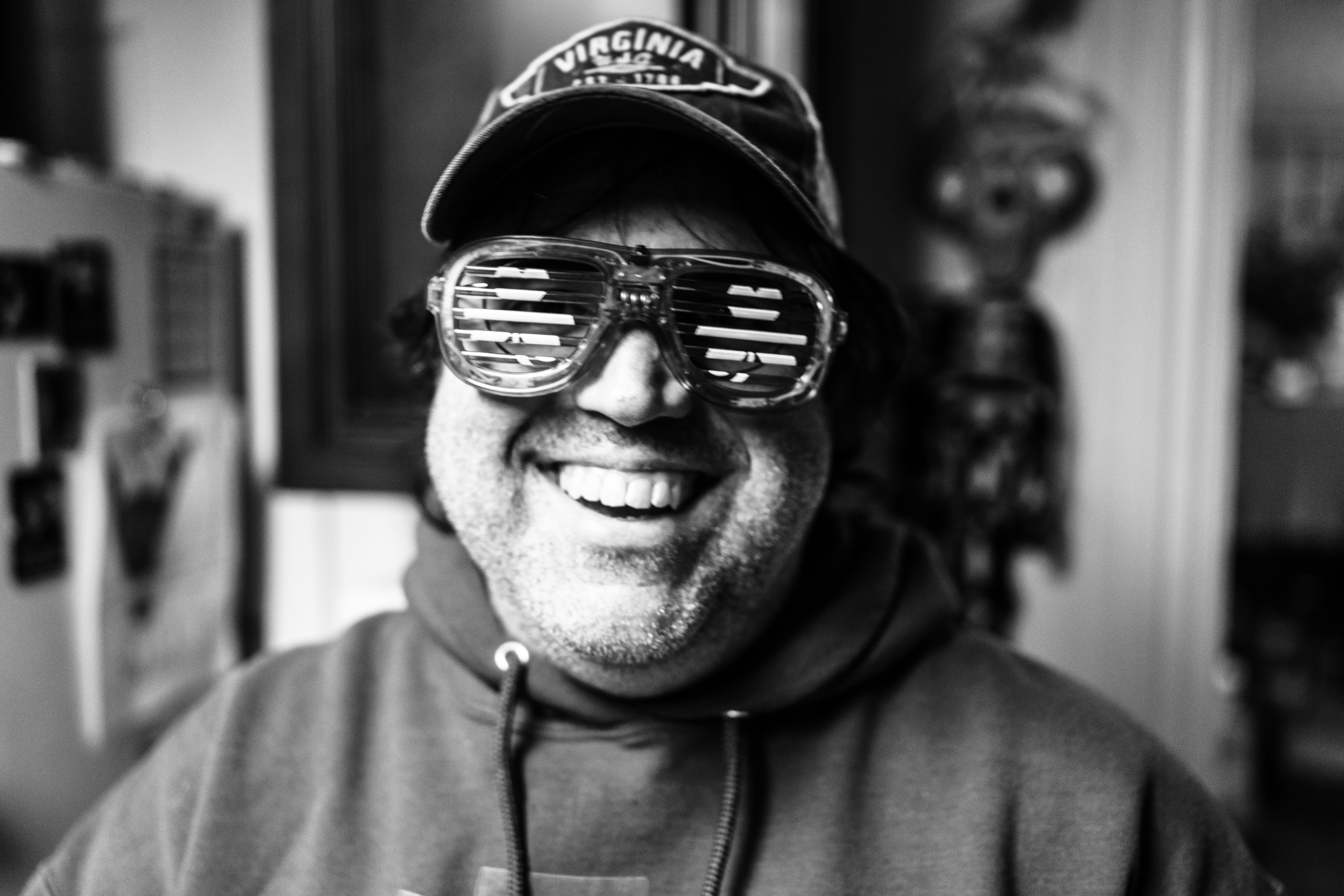 The photograph captures a man wearing playful, striped sunglasses and a capped smile that exudes warmth and humor. Shot in black and white, the intimate setting enhances the cheerful mood while the blurred background adds depth to the composition. The lighting softly illuminates his face, highlighting the joy in his expression amidst everyday surroundings.