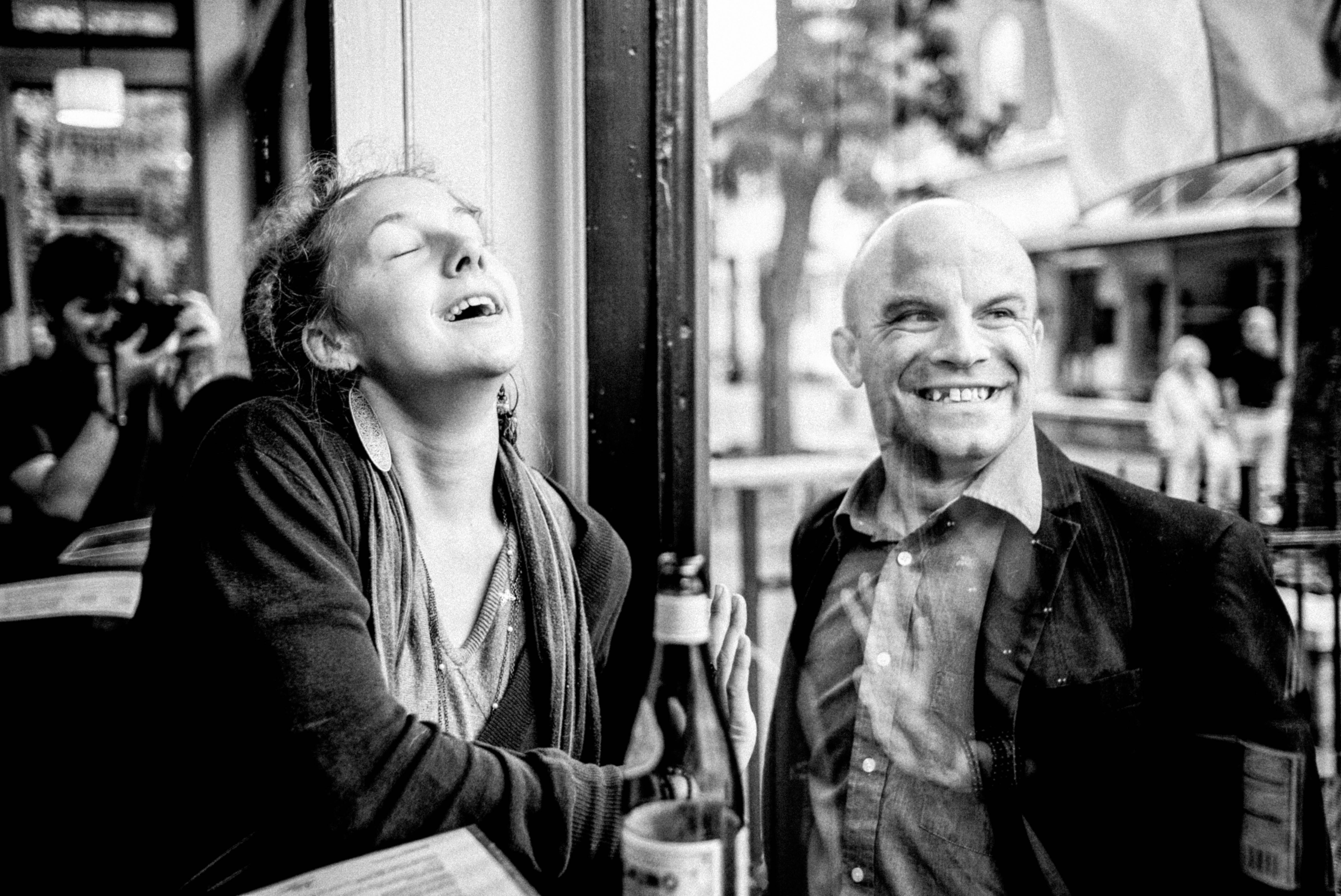 This black-and-white photograph captures an intimate moment between two people, lost in laughter and connection as they gaze out a window. The luminous natural light filters in, enhancing their joyful expressions and creating a nostalgic, candid mood. Reflections on the glass add depth to the composition, hinting at the lively surroundings outside while drawing focus to their shared experience.