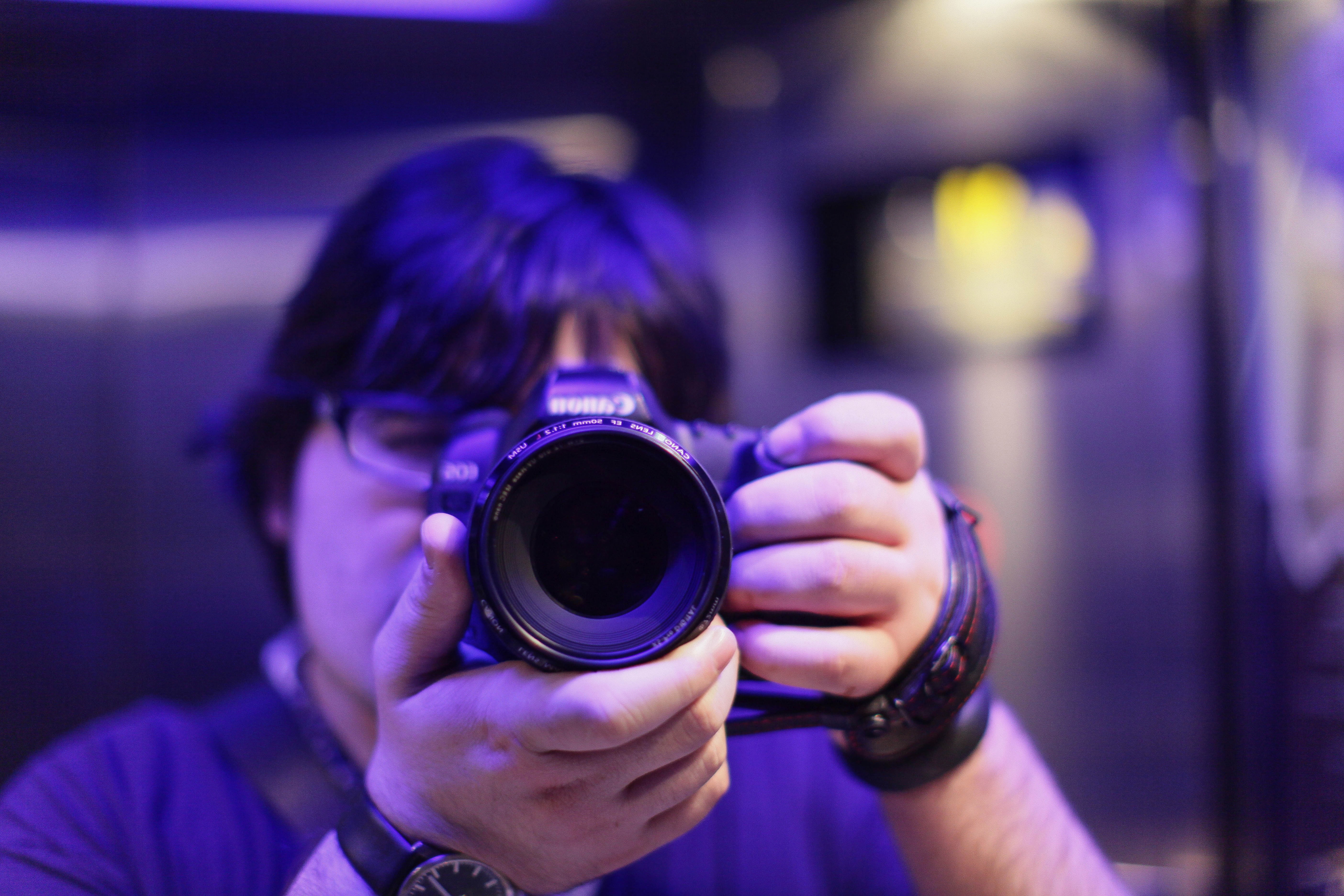 The photograph captures a young photographer holding a camera up to the lens, framed by the sleek, metallic interior of an elevator. A cool purplish hue washes over the scene, creating an intimate and contemplative atmosphere. The focused gaze behind the camera evokes a sense of self-exploration and creativity in a confined space.