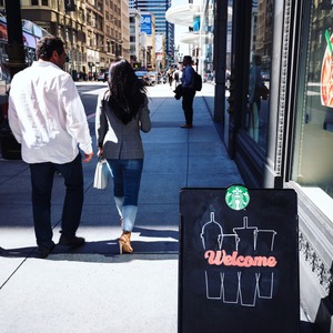 The photograph captures a sunlit urban sidewalk where two figures walk closely, their casual demeanor suggesting a relaxed moment amidst the city's busyness. A welcoming Starbucks sign stands prominently in the foreground, emphasizing a cozy vibe in contrast to the sleek buildings and bustling street life behind the couple. The bright, natural lighting enhances the sense of a vibrant day, inviting onlookers to participate in the lively atmosphere.