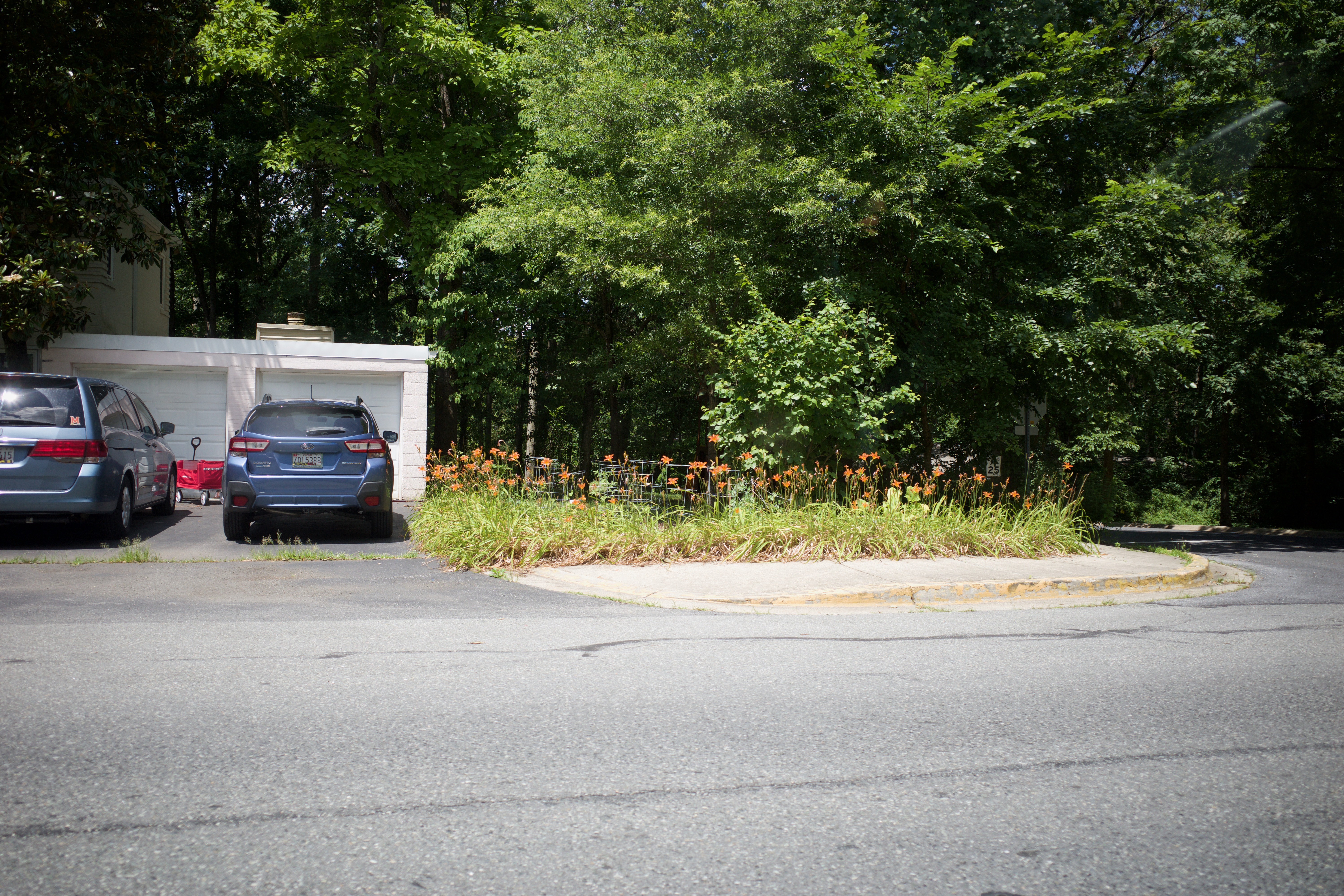 A quiet street corner framed by vibrant greenery and blooming orange flowers evokes a sense of tranquility. Two parked cars sit close by, hinting at suburban life, while dappled sunlight filters through the leaves, casting soft shadows on the pavement. The overall mood is peaceful and inviting, capturing a moment of nature thriving in a residential setting.